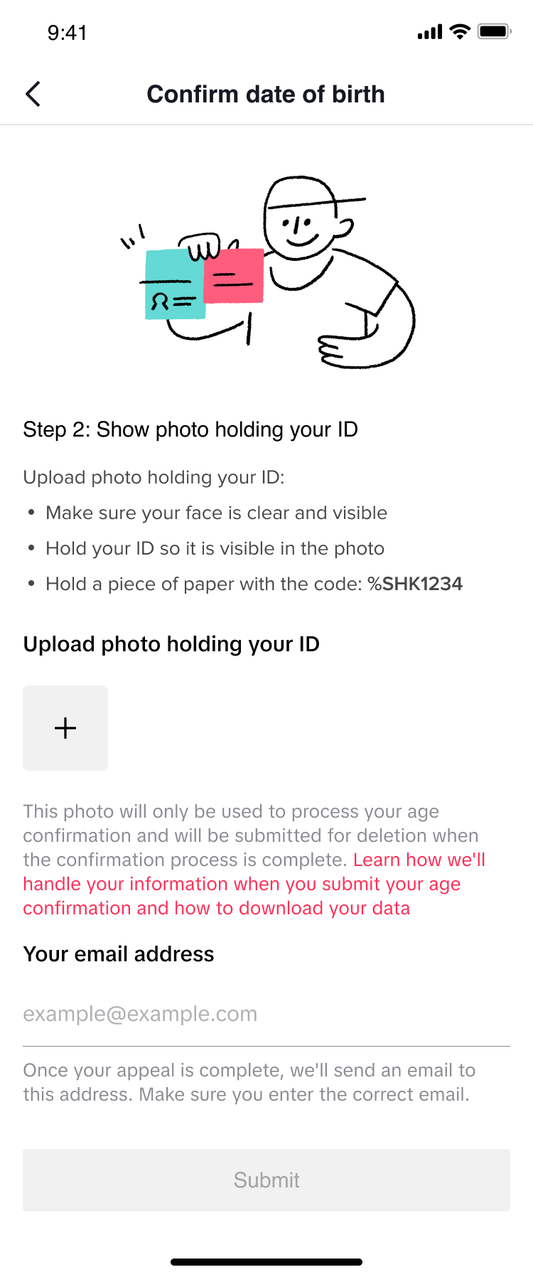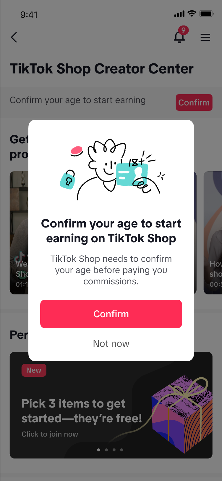 TikTok Shop致力于为所有用户和合作伙伴营造安全可靠的环境。为确保负责任地授予达人使用TikTok平台变现功能的权限,验证达人是否年满18岁至关重要。年龄验证流程有助于保护年轻用户,也符合我们对遵守法律要求并为达人和消费者维护安全可信的市场的承诺。非常感谢您在此过程中的理解与合作,我们将共同努力,营造一个积极安全的网络社区。
