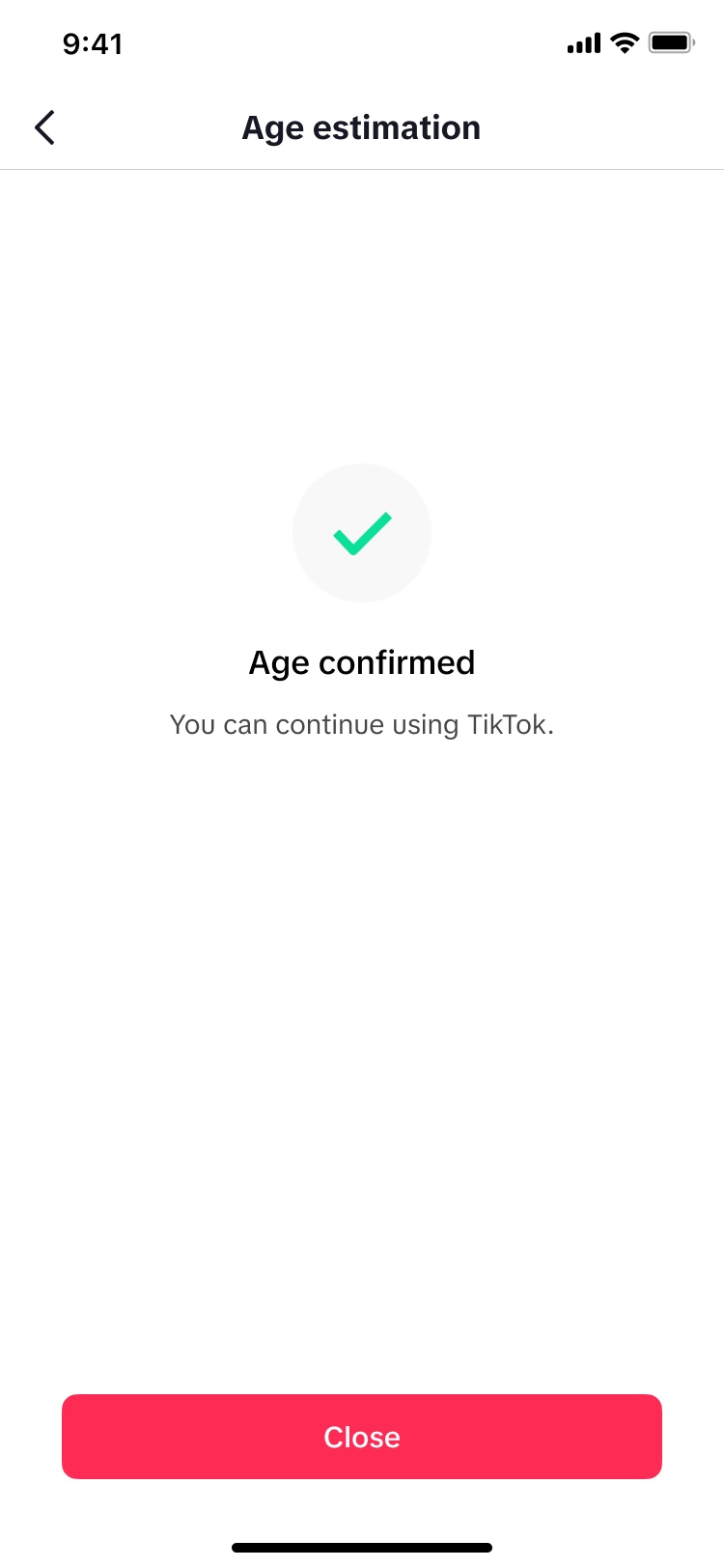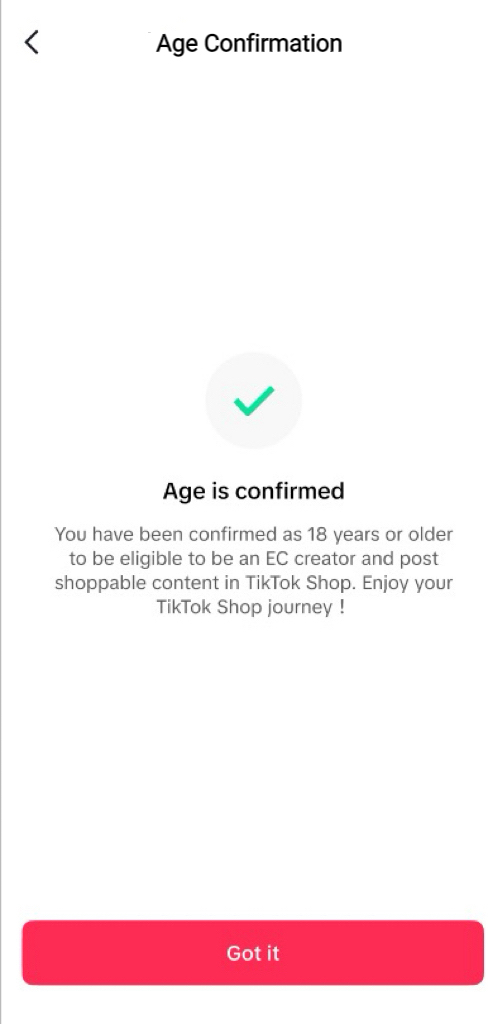 | 1. 接收结果(结果将在24小时后以应用内通知或电子邮件的形式发送): 2. 年龄验证成功 3. 年龄验证失败 4. 申诉流程(如验证失败) | A. 年龄验证成功 成功完成年龄验证流程(即达人经验证年满18周岁)后,达人账号将正式获得TikTok Shop电商权限,包括在TikTok上传的视频中宣传推广商品以及在TikTok直播中推广商品的权限。 ![]() ![]() |