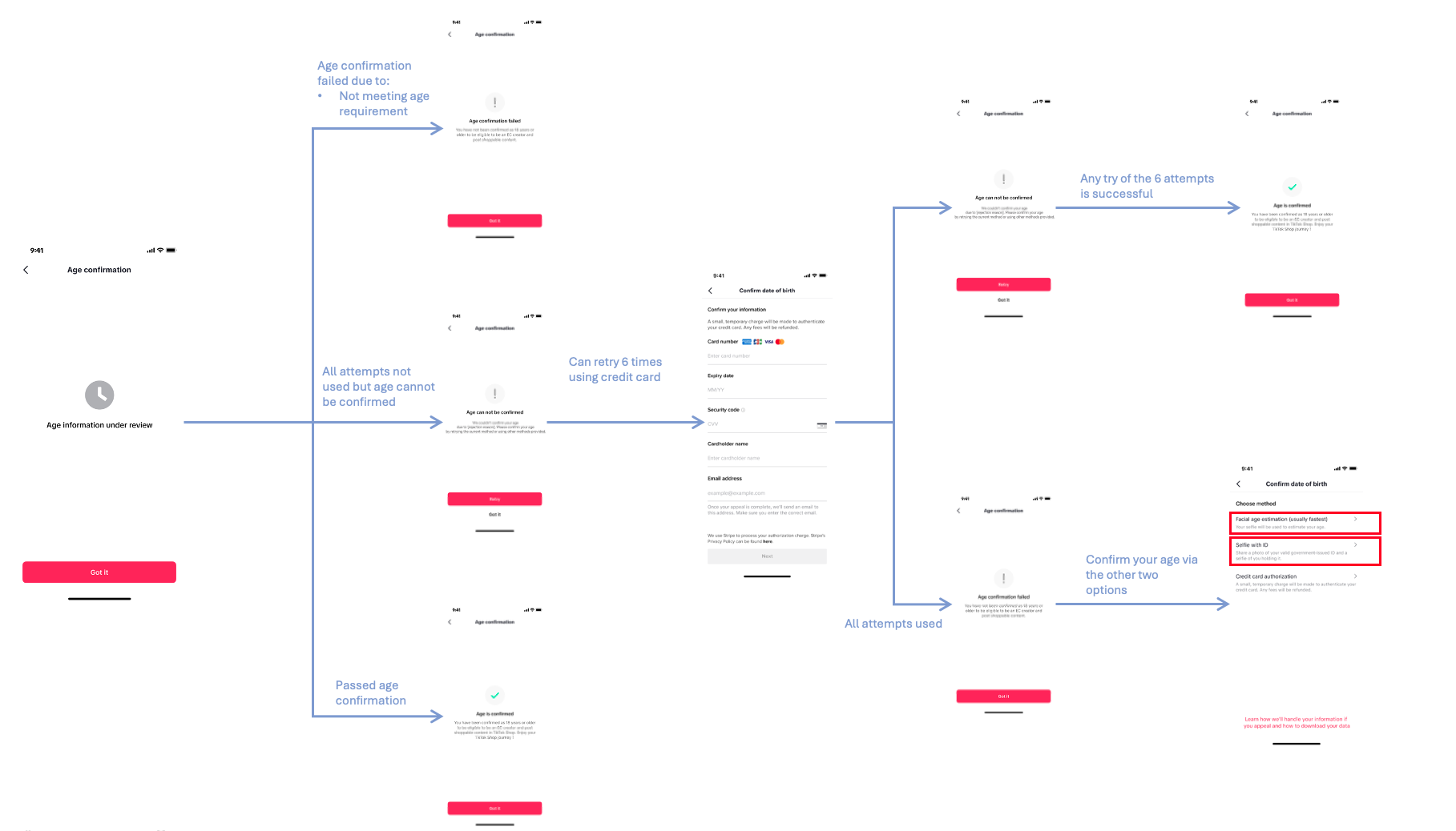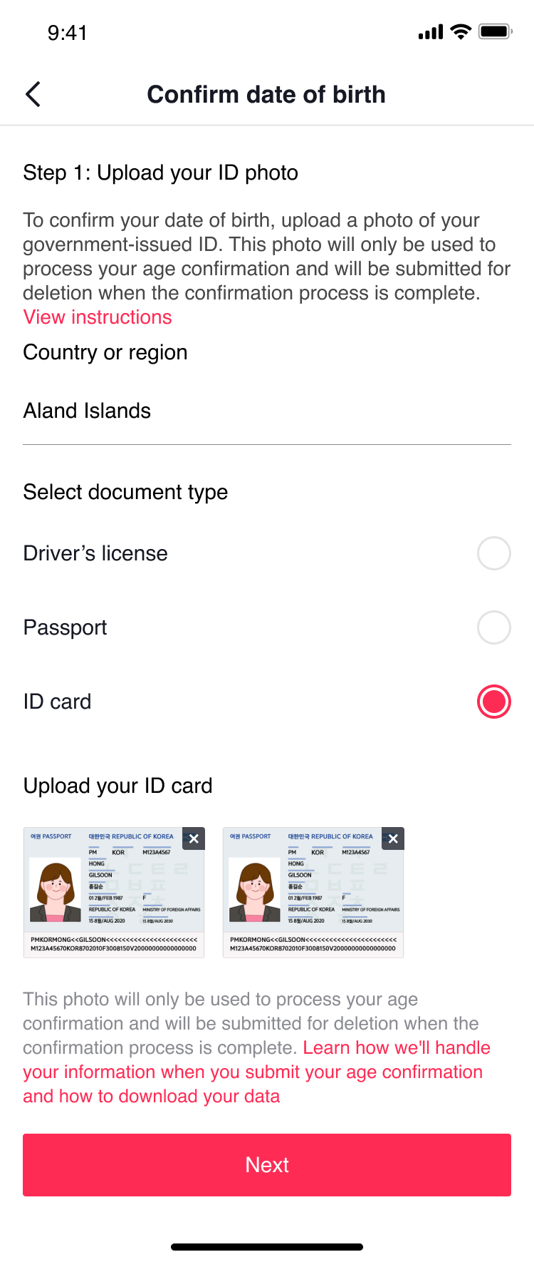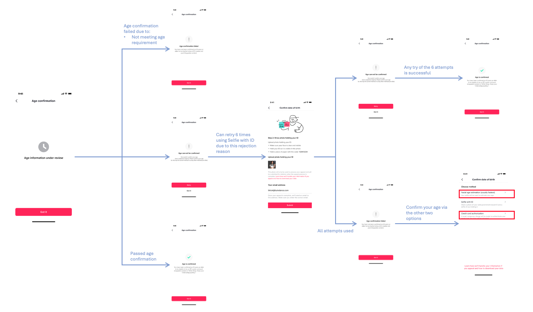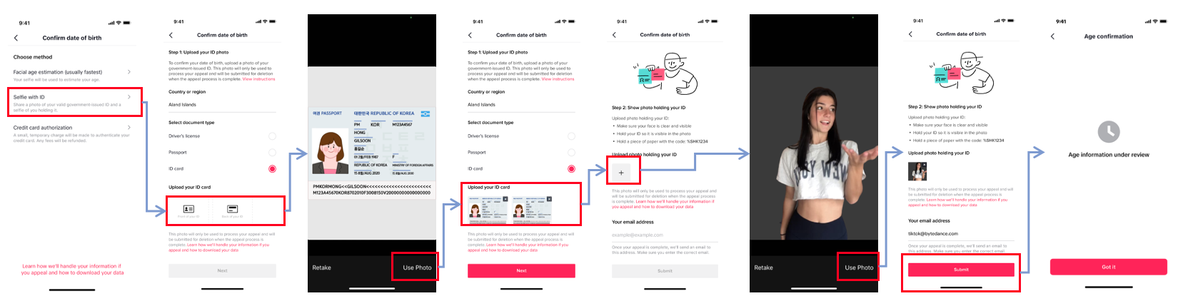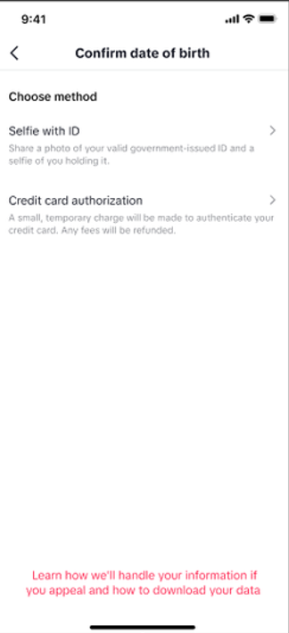 | | C. 申诉 – 若多次尝试“手持身份证自拍”仍无法验证年龄,达人可以通过其他两种方法(“人脸年龄估计”或“信用卡授权”)再次进行验证,以完成年龄验证流程。请注意,再次进行验证不适用于由于达人未满18岁而导致的验证失败(即在这种情况下不允许申诉)。 ![]() ![]() |