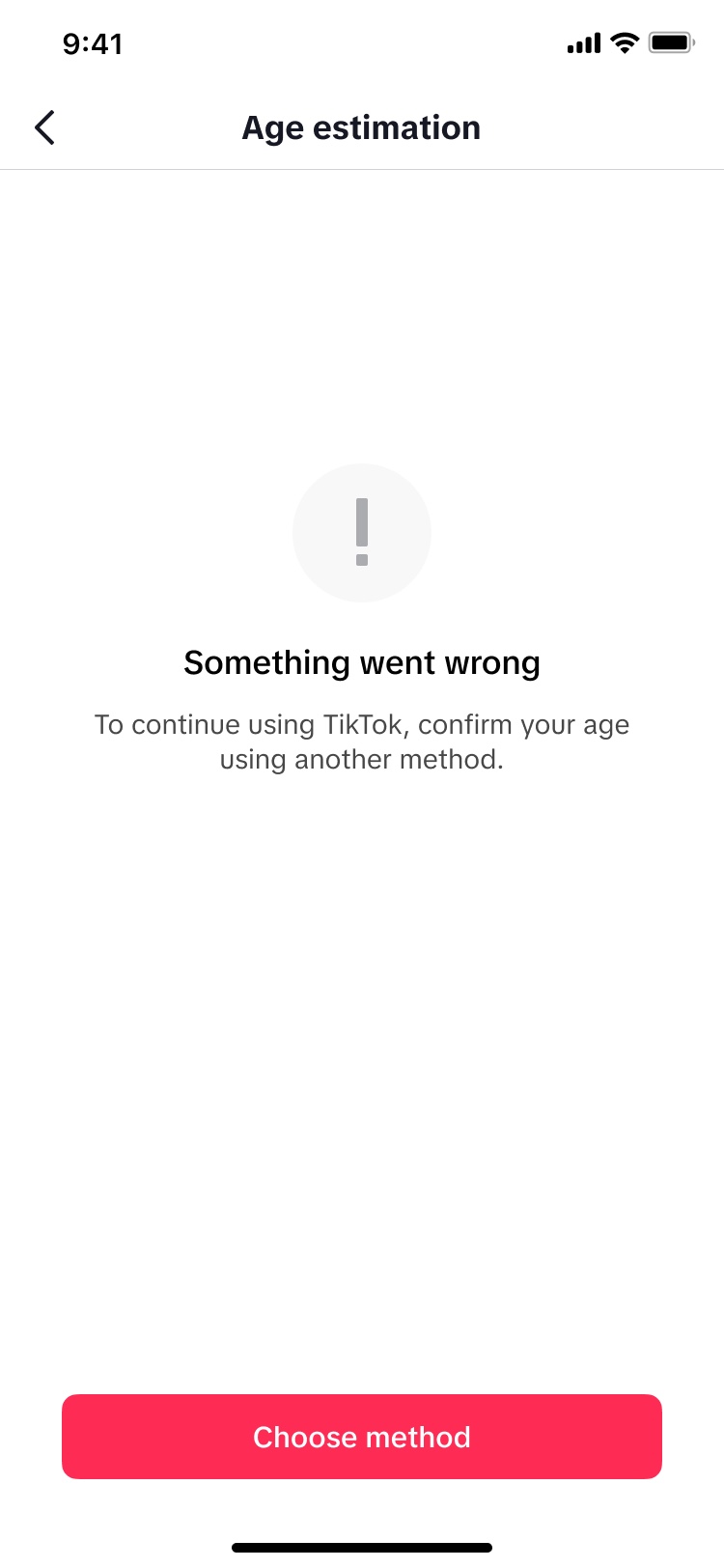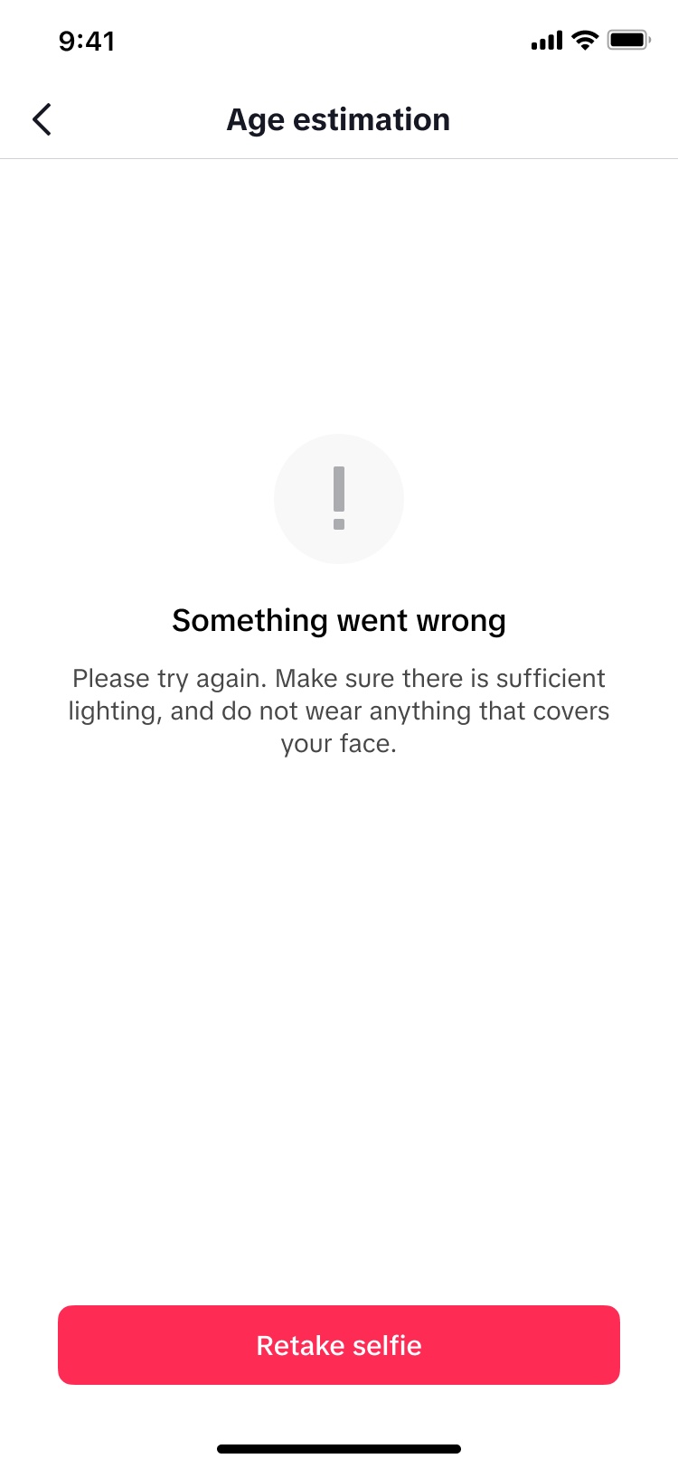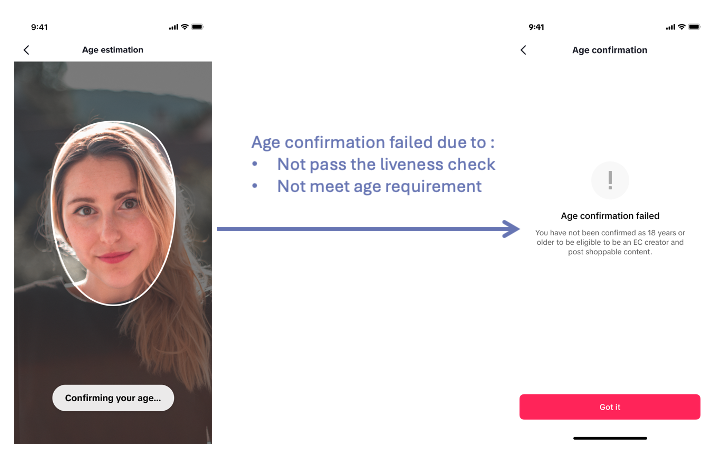 | | B. 年龄验证失败 – 若由于达人未满18周岁或未通过活体检测等原因导致年龄验证失败,则达人账号无法获得TikTok Shop电商权限。 ![]() ![]() – 若由于技术问题(如浏览器兼容问题或技术错误)无法通过“人脸年龄估计”验证年龄,达人可以通过相同方法再次进行验证,最多可验证3次。 ![]() ![]() |