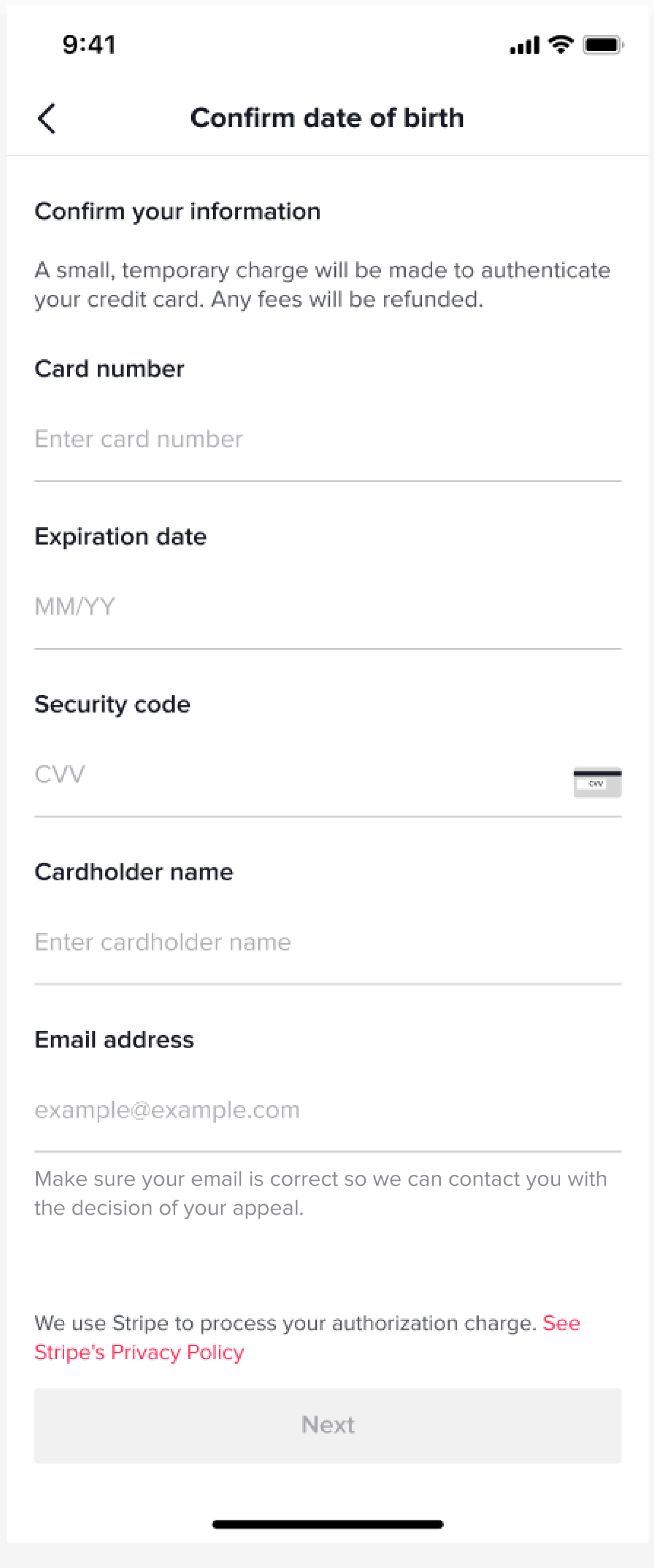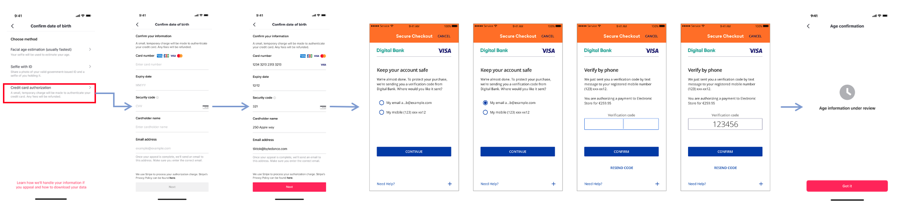 | | B. 年龄验证失败 – 若由于达人未满18岁导致年龄验证失败,则达人账号无法获得TikTok Shop电商权限。请注意,这种情况下达人无法再次进行年龄验证。 – 若由于以下原因无法通过“信用卡授权”验证年龄,达人可以继续使用相同方法再次进行验证,最多可验证6次: 1. 信用卡无效。 2. 未及时完成第三方验证。 |