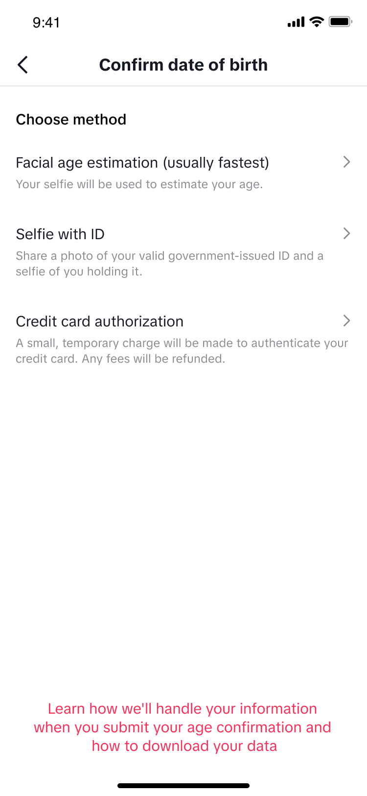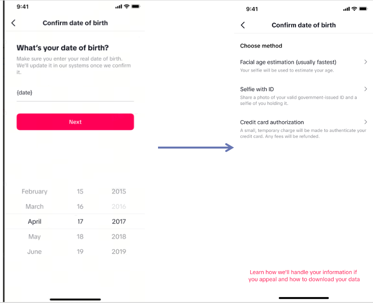 | | C. 申诉 – 若多次尝试“信用卡授权”仍无法验证年龄,达人可以通过其他两种方法(“人脸年龄估计”或“手持身份证自拍”)再次进行验证,以完成年龄验证流程。请注意,再次进行验证不适用于由于达人未满18岁而导致的验证失败(即在这种情况下不允许申诉)。 ![]() ![]() |