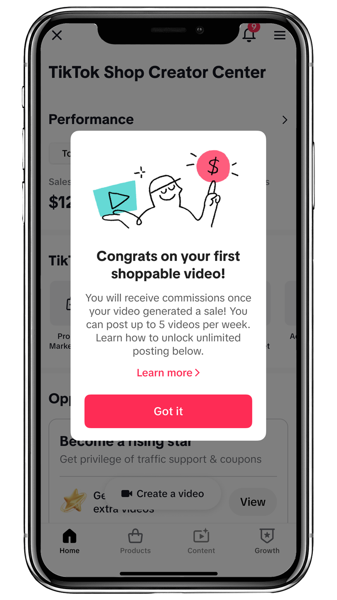 当观众通过您的购物视频、直播或分享的联盟链接下单时即可获得佣金。粉丝量低于5000的TikTok Shop达人每周限发5条购物视频。立即创建佣金账号开启变现。