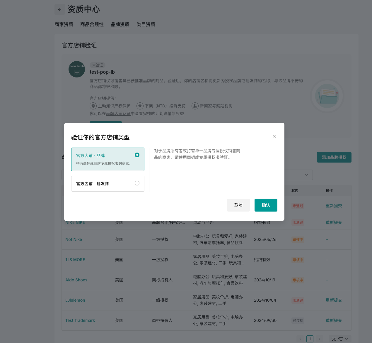 符合条件的卖家欢迎申请徽章,但需注意:官方店铺仅可销售自有品牌产品。若你不想受此限制,可在资质中心单独完成商标验证,无需参与官方店铺认证。