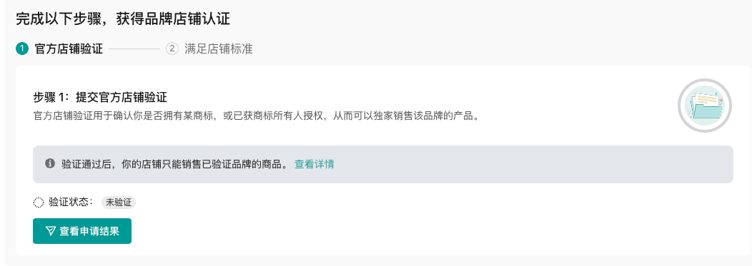 作为获得官方店铺徽章的第一步,我们要求卖家申请官方店铺资质。店铺验证是确认您店铺真实性和品牌授权的过程,您的店铺通过验证后,您将能够继续完成其他要求,以获得官方店铺徽章。 对于符合条件的卖家,您将在品牌认证页面底部看到一个模块,引导您完成验证。