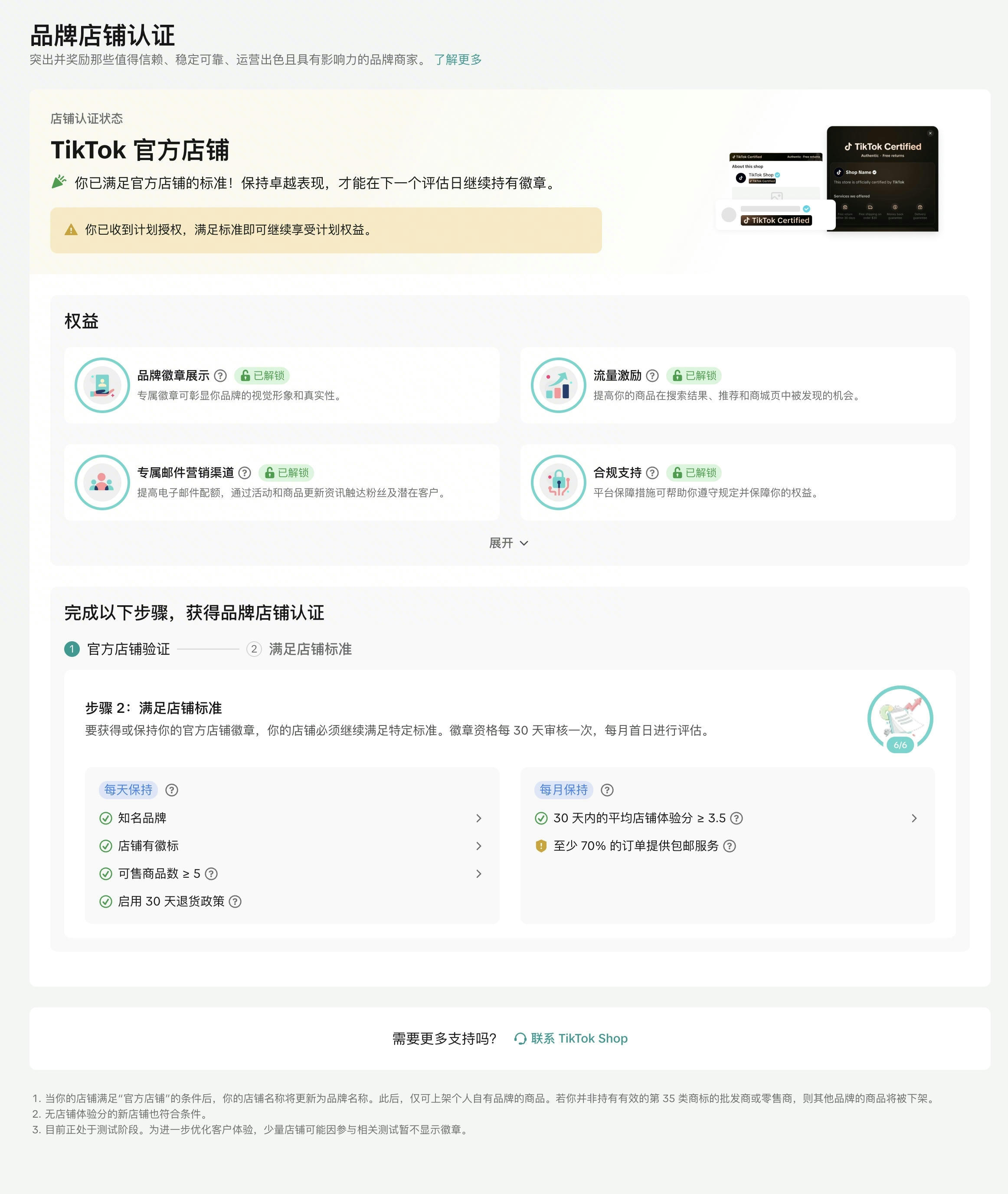 每日维持:需每日满足的标准包括:具备知名品牌资质、已上传 logo、知识产权风险低、至少 5 款可售商品、提供 30 天退货服务