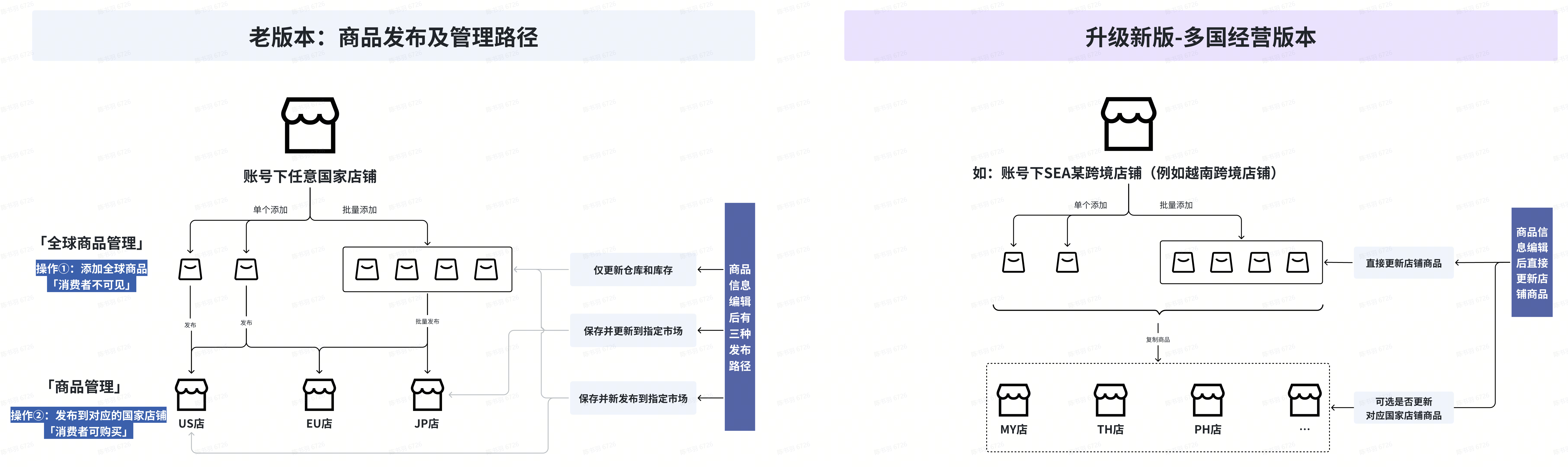 | 存量商品的处理: 存量商品默认走老链路管理,升级后只做迁移打标,即无法享受本次升级后带来的便利和新功能(预售等) 注意事项 1. 升级后,暂时将无法再使用ERP进行全量商品信息管理,需在店铺商品管理页面进行商品管理 – 注1:ERP编辑店铺商品的价格、库存信息依然可用 (但请注意提前与服务商确认是否使用店铺信息更新接口) – 注2:待后续平台API 及 服务商ERP升级后,才可以用ERP完整管理新版商品 2. 走PC端/Excel 直接添加的店铺商品也属于新版商品,无法使用ERP进行管理 3. ERP链路新发商品,依然走原有全球品->店铺品的两层链路,后续如无需再使用ERP编辑信息,可在页面操作升级 | |
