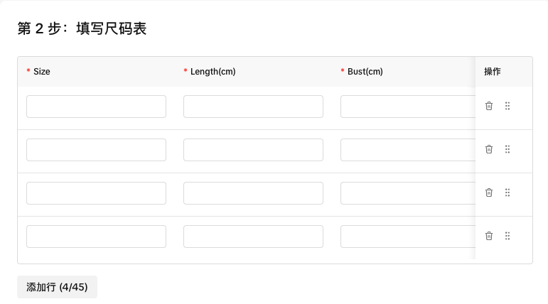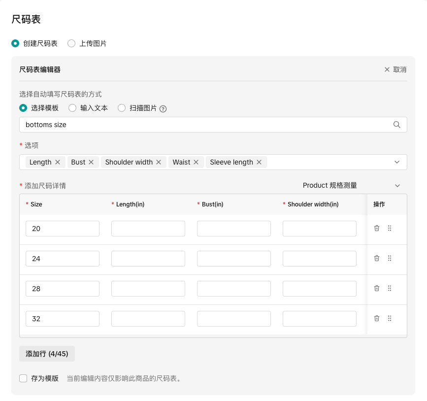 支持对已保存的尺码表进行复制、编辑和删除操作,也可应用于同类目的其他商品。