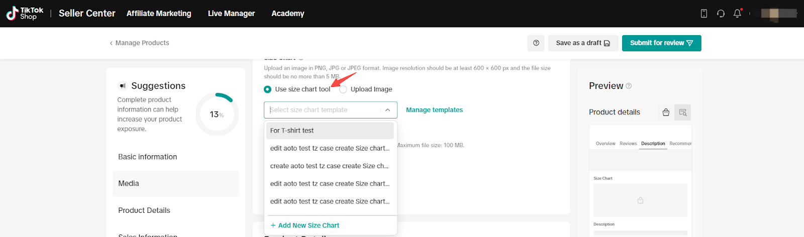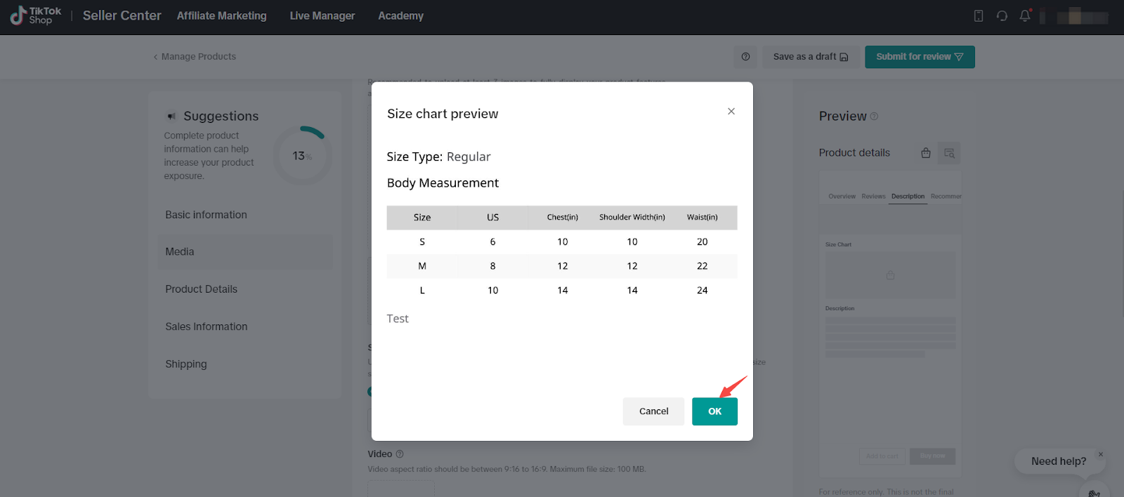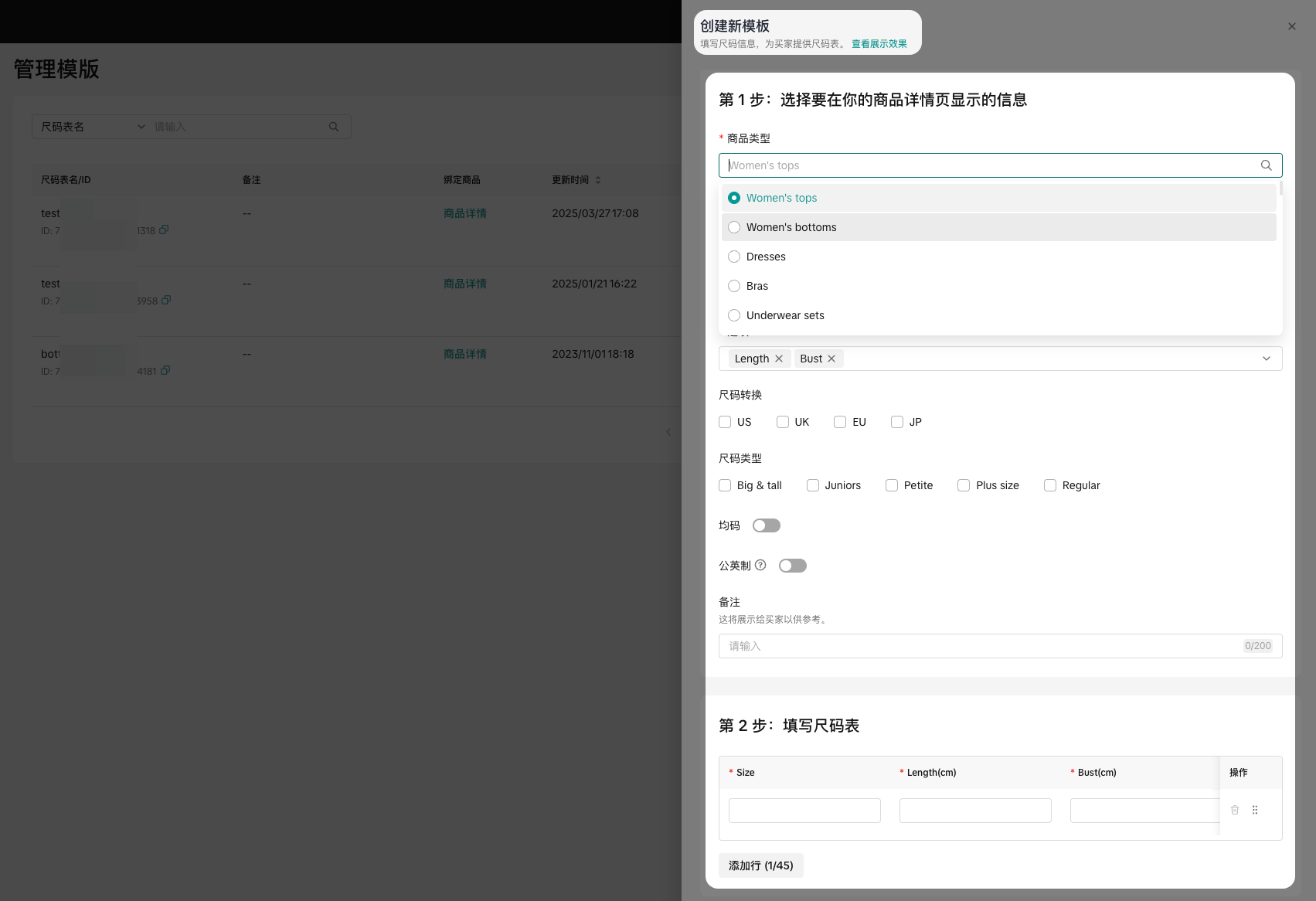 [方法1] 商家中心 > 商品 > 管理商品 > 添加新商品 (服饰)> 详情 > 尺码表