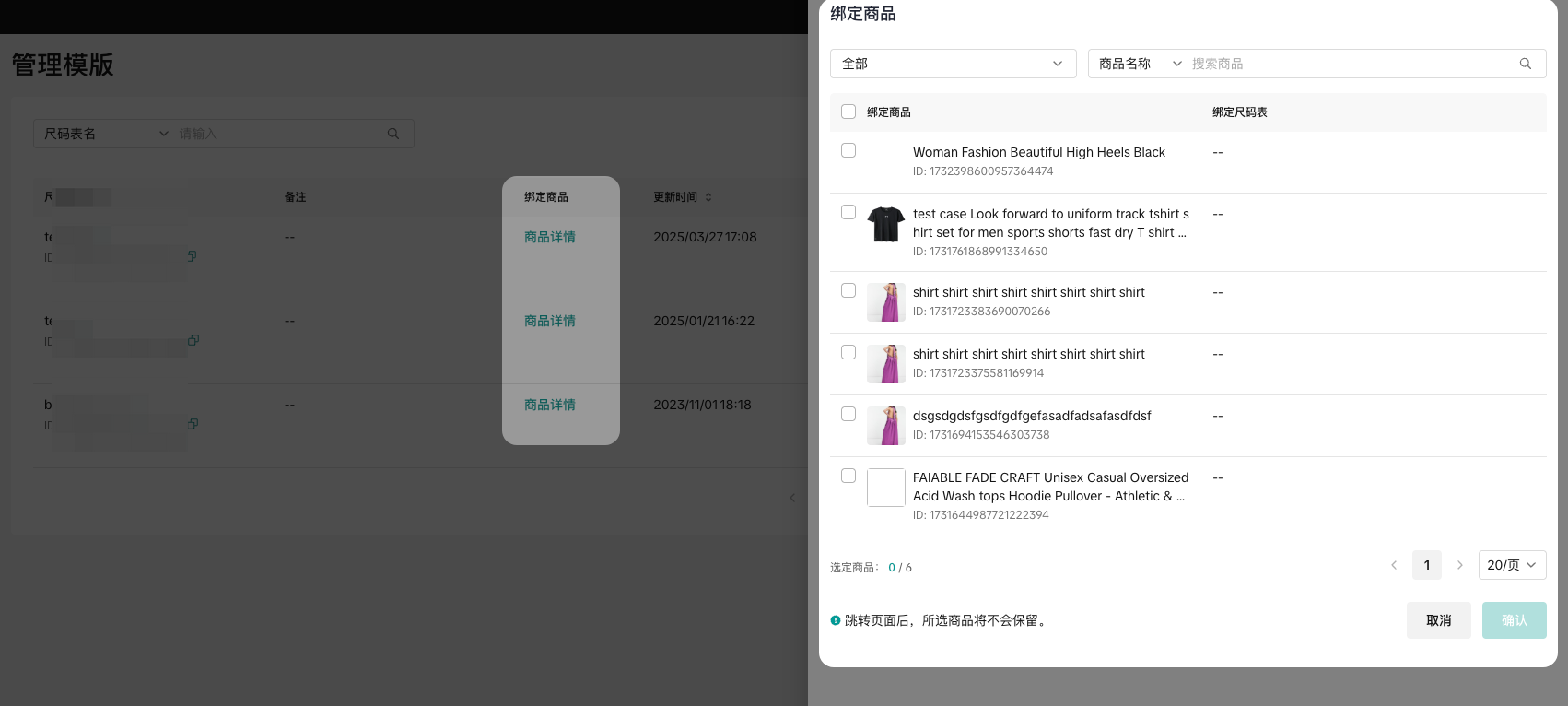 在“批量管理尺码表”中点击“商品详情”,选择要使用尺码表的商品。点击“确认”应用设置。