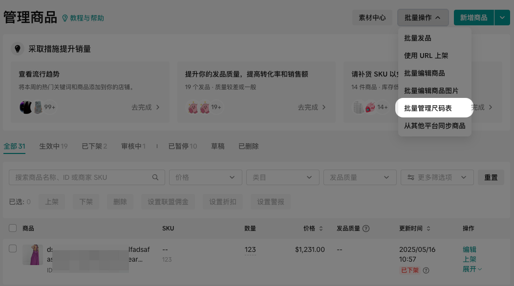 [方法2] 商家中心 > 商品 > 批量操作 > 批量管理尺码表 > 添加新尺码表
