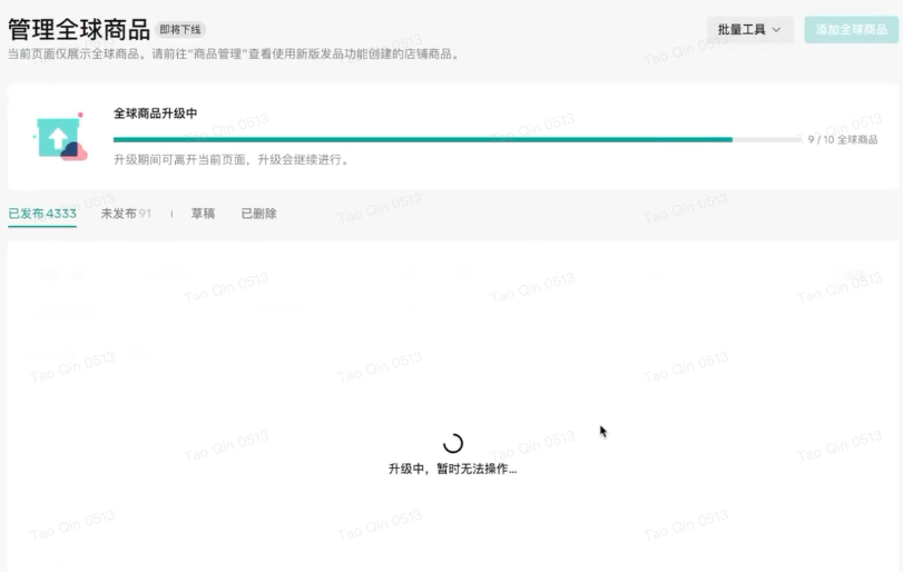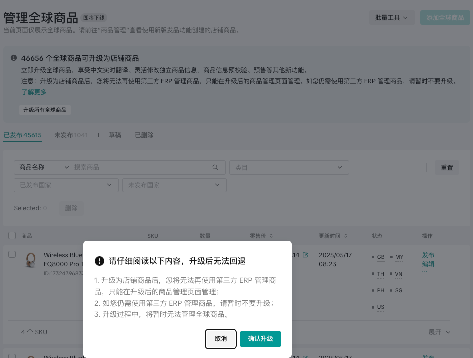 升级过程预计1min,升级过程中,将暂时无法管理全球商品。升级后不可回退。