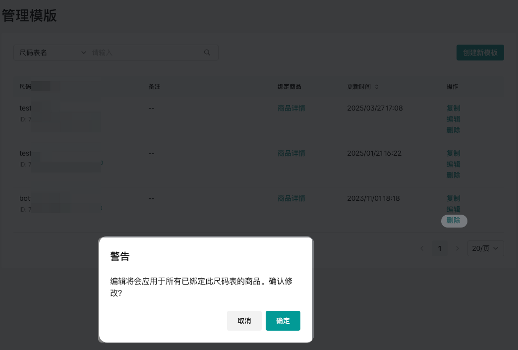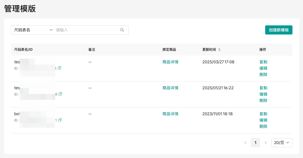 - 已经创建成功的尺码表同样支持复制、编辑、删除等操作。需注意,如果该尺码表已经绑定了商品,则无法删除。