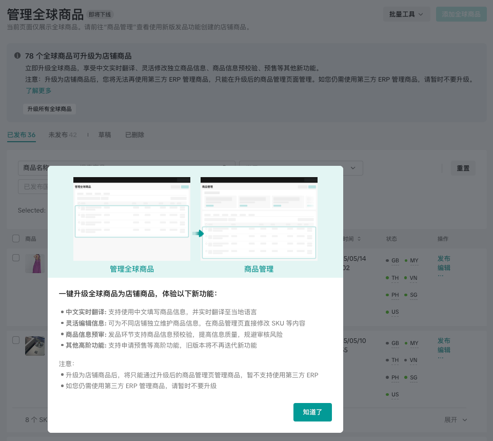核心变化:点击一键升级后,您店铺下原「管理全球商品」功能下的所有商品信息会自动升级迁移至「商品管理」功能页面下;所有商品信息的状态依然维持原状不变,正在售卖的商品状态不会受到影响;后续所有商品发布及管理动作全部在「商品管理」功能页面操作,原「管理全球商品」模块将不再显示存量商品信息。