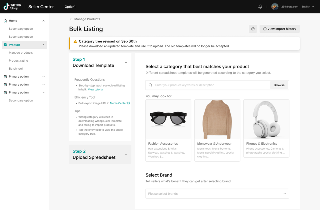 - 通过路径Manage Products->Bulk Action->Bulk Listing进入页面,上方将看到banner提示。输入一个产品类目,下载更新后的模板