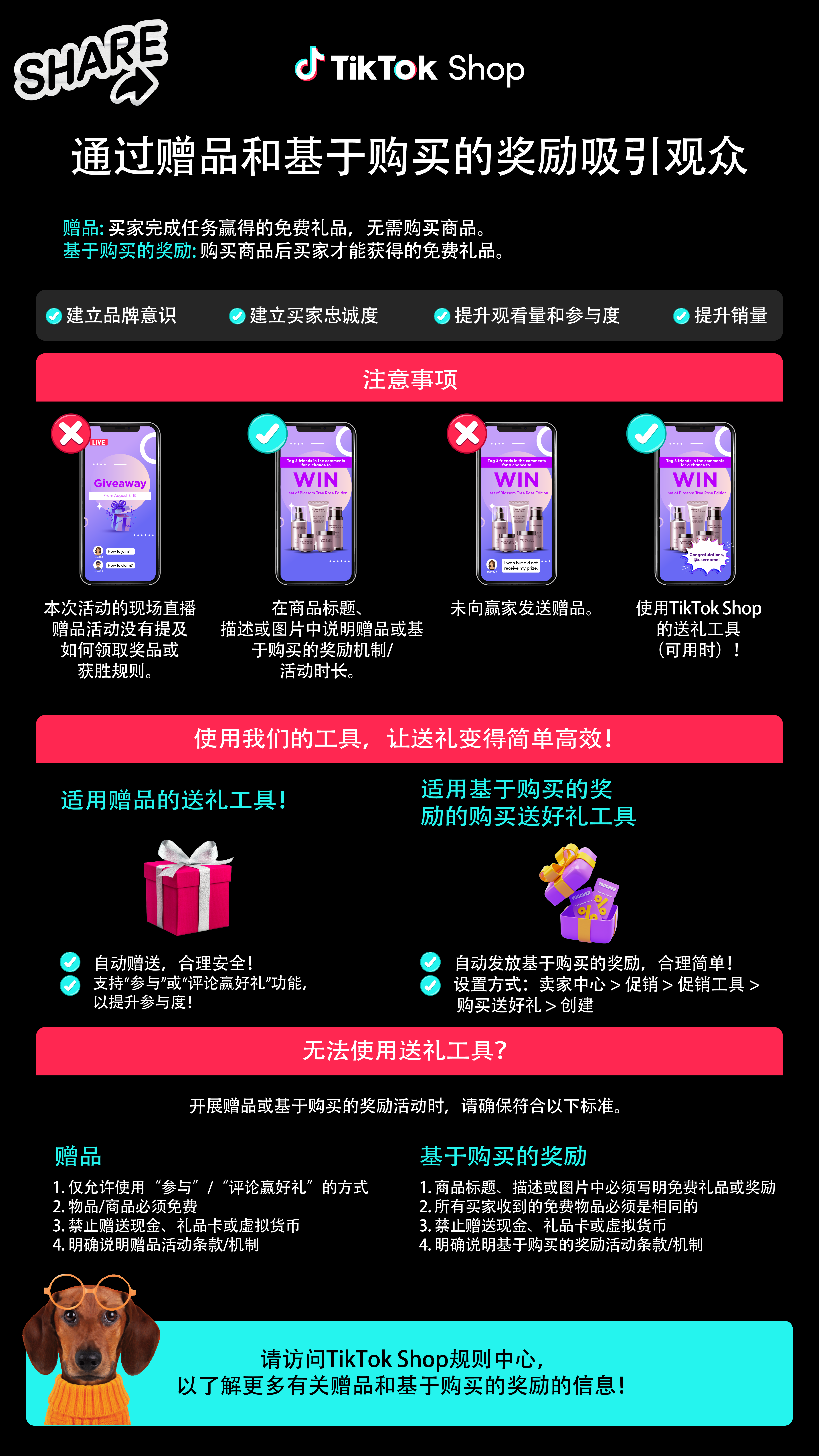 对于“免费赠品”和“基于购买的奖励”的所有要求已列在我们的《TikTok Shop赌博、赠品及盲盒属性商品管控规则》当中。在向用户提供相关奖励之前,卖家/达人必须阅读该规则。