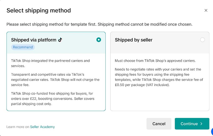 一种由TikTok Shop负责配送的物流选项。下单后,系统自动生成运单号和运单标签。商家负责拣货、打包和贴标。包裹将移交指定的平台快递员进行配送。
