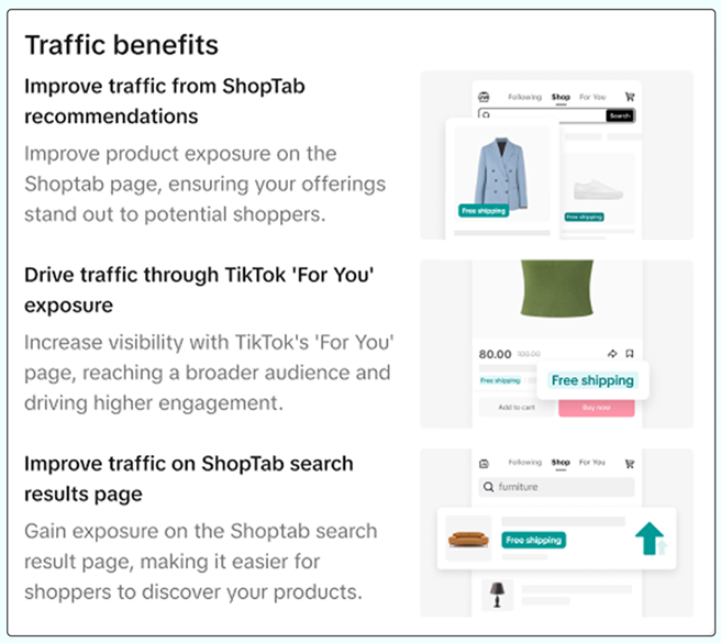 | 提高商品在TikTok的曝光度 | 享受运费、大促、商家政策、商城频道和新用户补贴等各方面的专属福利 | 您的商品将突出显示包邮标识,并在商城频道、大促页面中解锁专区。 |