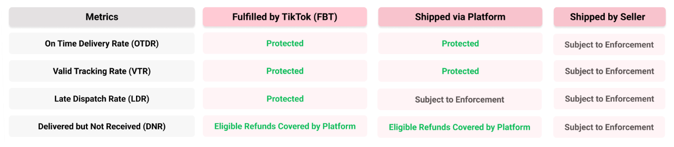 | 指标 | 类自营模式(由TikTok履约) | 平台发货 | 商家自发货 |