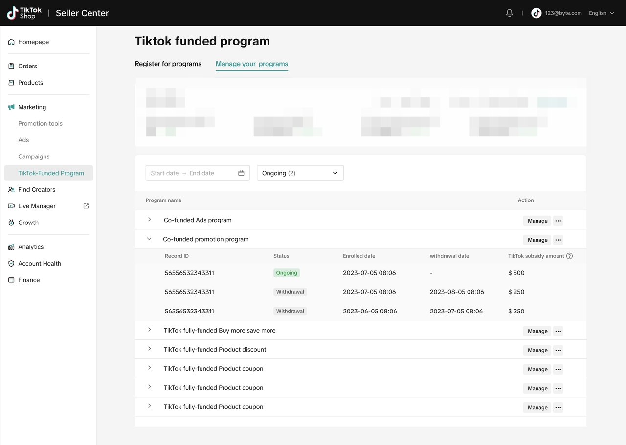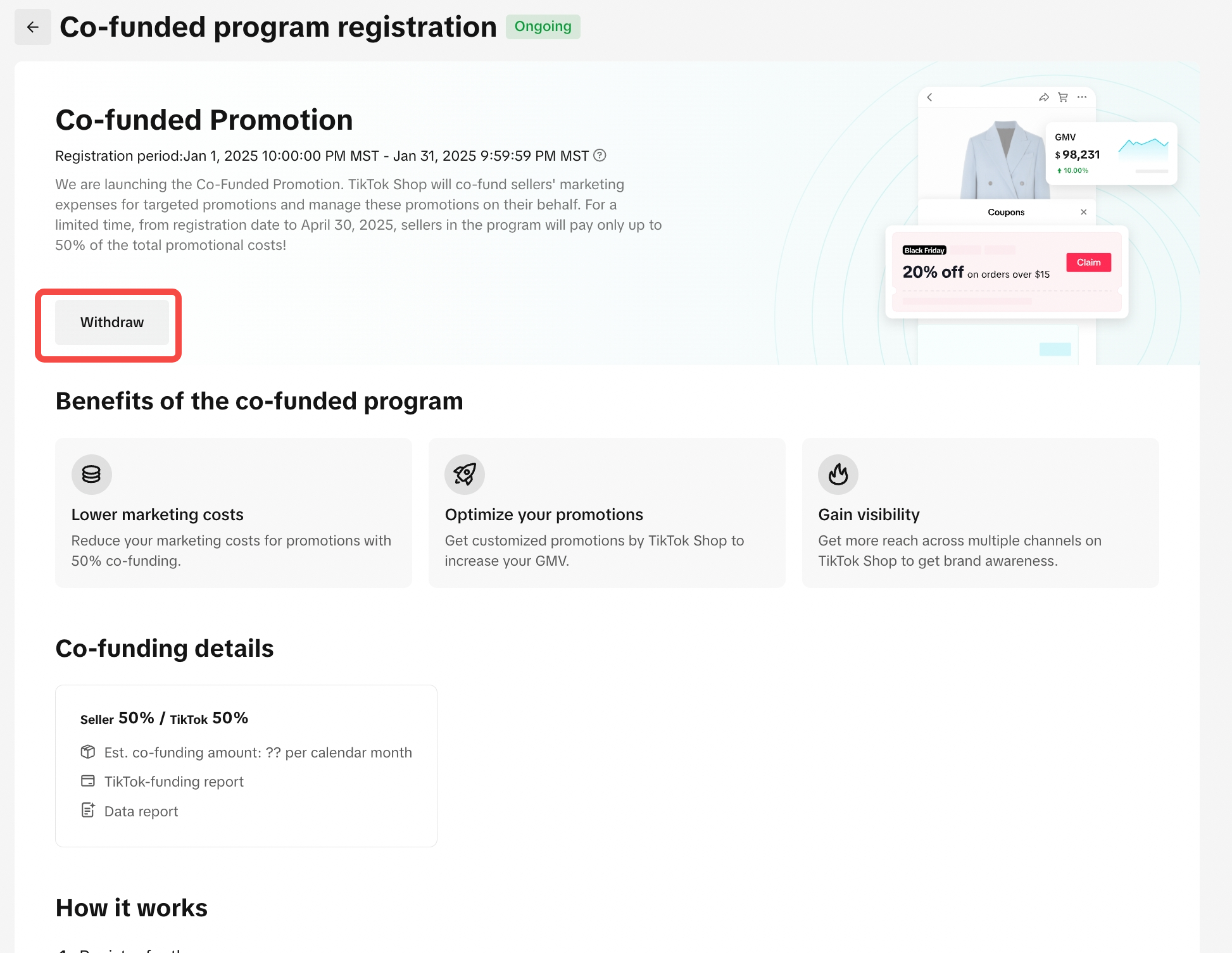 能,您可随时退出计划。进入“计划管理”,点击退出按钮。取消报名后,所有促销活动将立即终止。若日后想再次加入,需通过“商家中心”营销菜单下的“TikTok资助页面”重新手动报名。请注意,退出共资促销后,计划内的所有权益将立即终止。