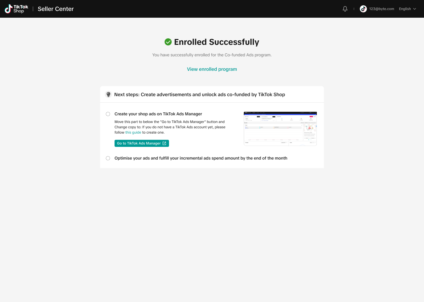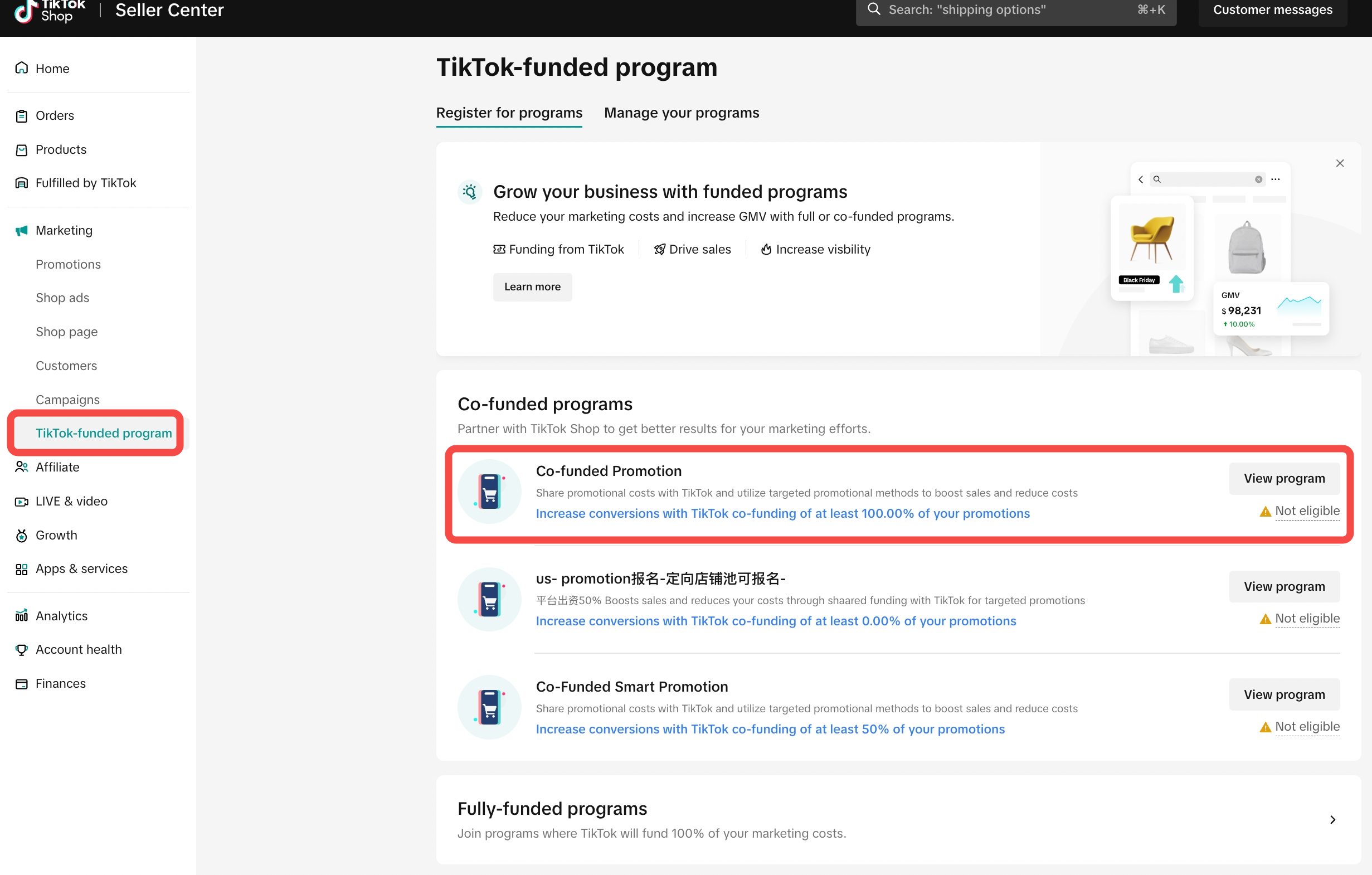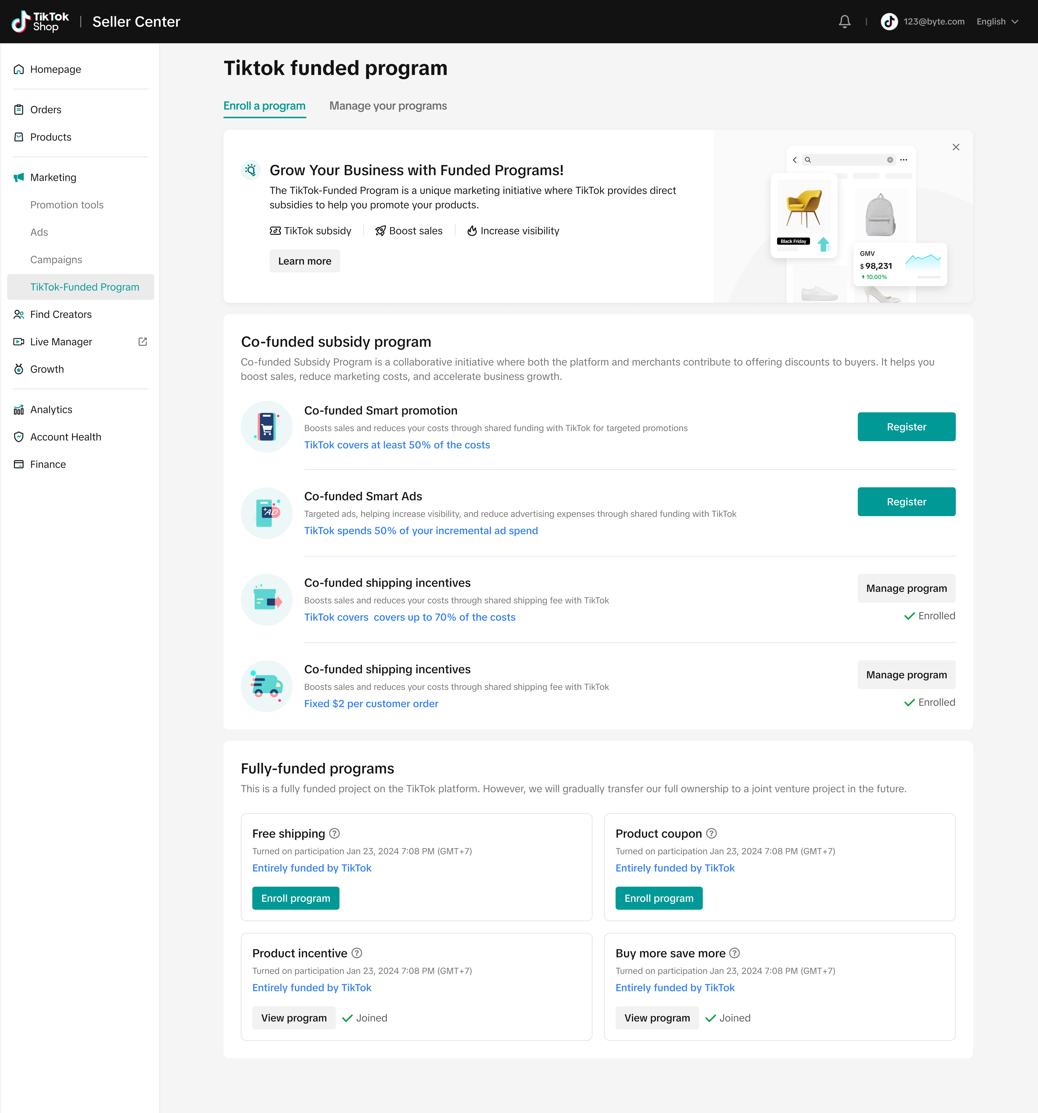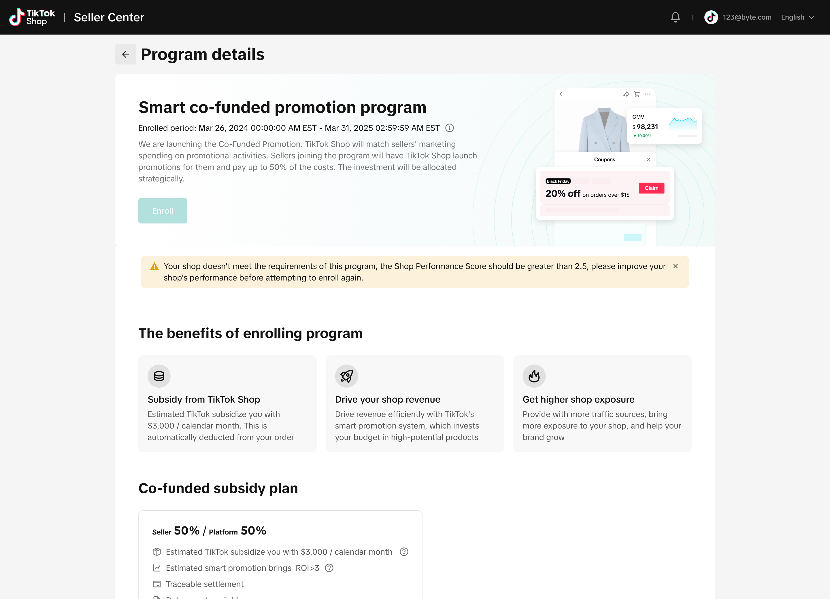 会。您的店铺体验分达到计划门槛值后您就能加入计划。进入营销 > TikTok资助计划 > 共资促销即可报名参与。