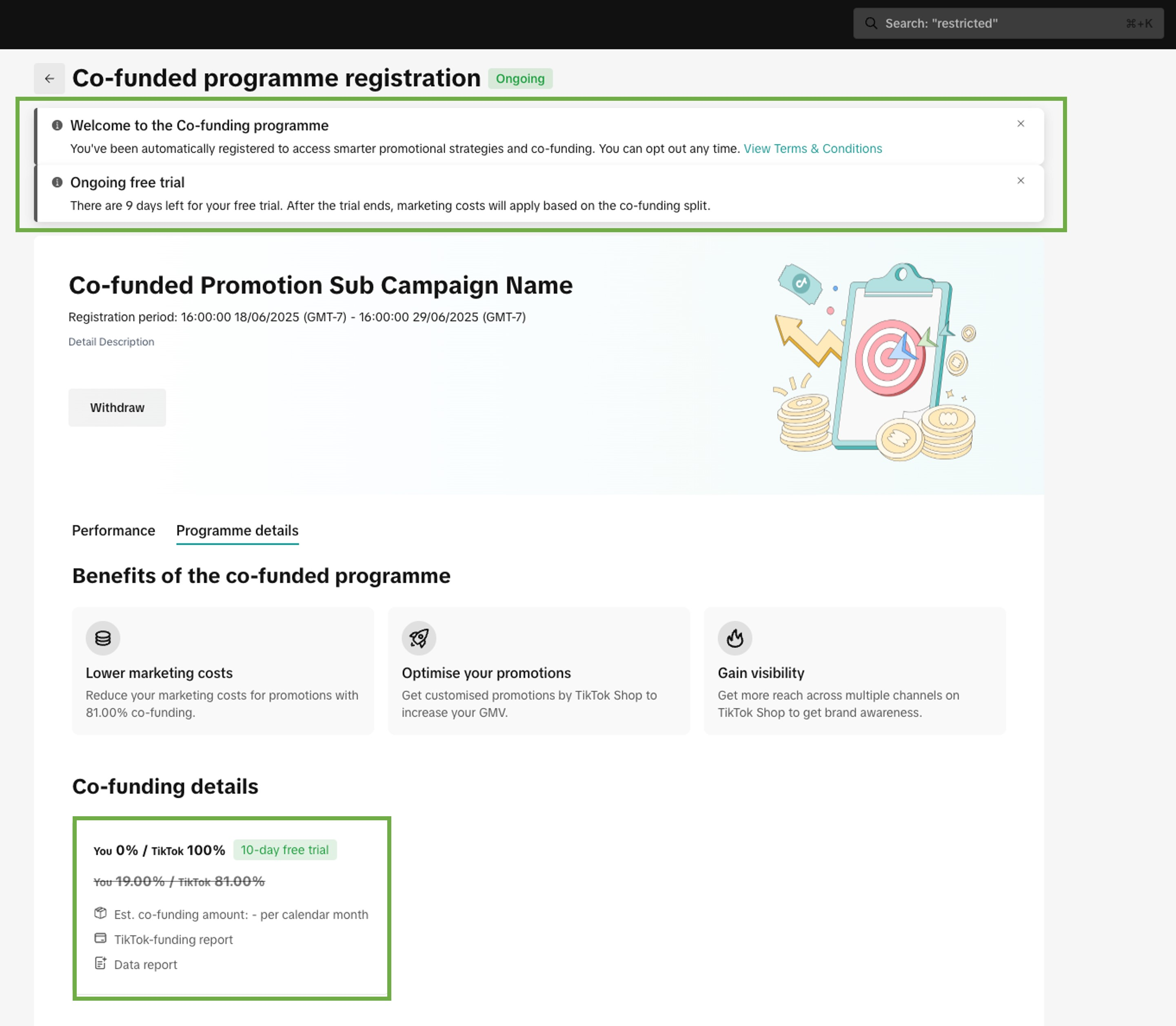 您可随时选择退出试用,但请注意:一旦退出则无法重新参与试用。若重新加入,您将直接进入共资模式(商家承担15%,TikTok Shop承担85%)。请注意,出资比例可能调整。最新信息将在商家中心计划页面更新。