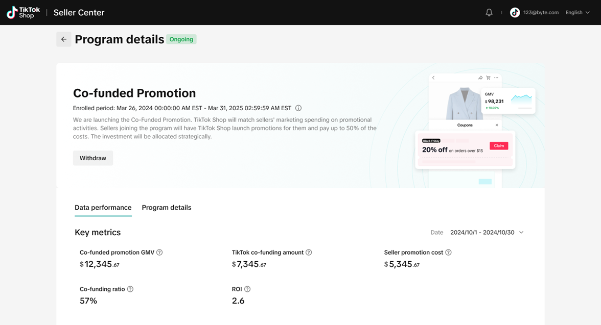 共资促销是TikTok Shop推出的一项计划,商家投入推广资金,TikTok则通过策略性分配,将资金用于商品券、新客折扣等多样化促销活动。平台管理所有资金投放,依托先进的数据驱动洞察,致力于为商家实现投资回报的最大化。