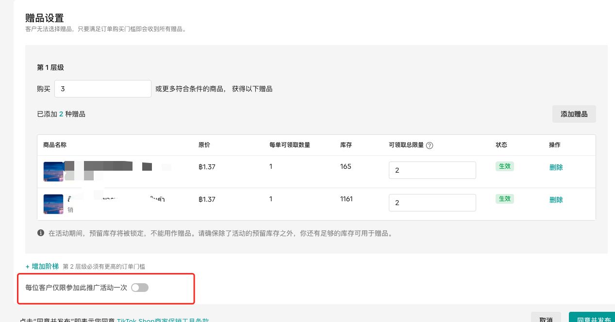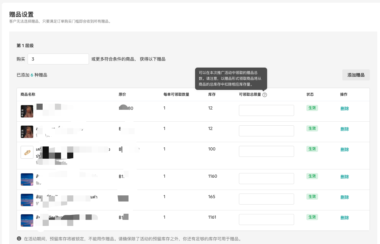 在活动期间,赠品的可领取数量库存将被锁定,不能用作赠品,请确保有足够的库存可用于赠品。