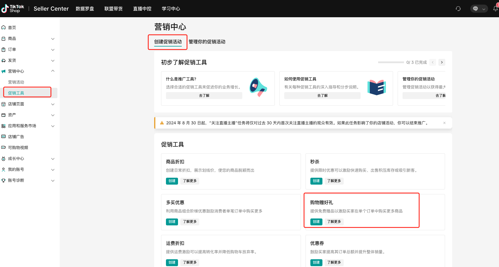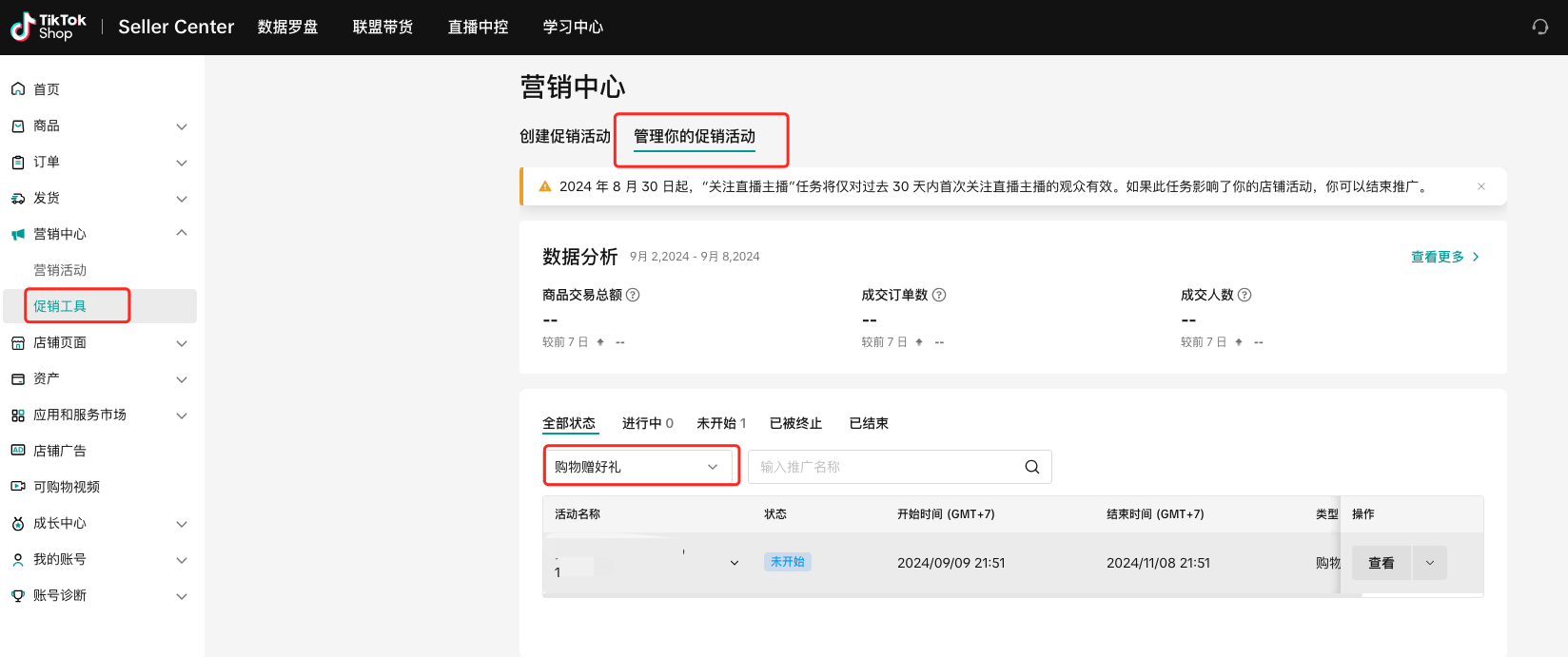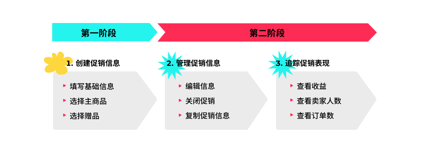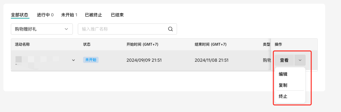 商家可以在管理你的促销活动中查看正在进行、未开始、已结束的购物赠好礼活动的详细信息。