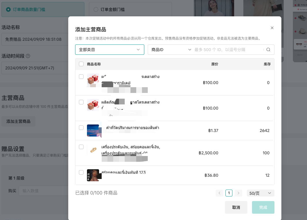 最多可以添加100个主商品到购物赠好礼活动中