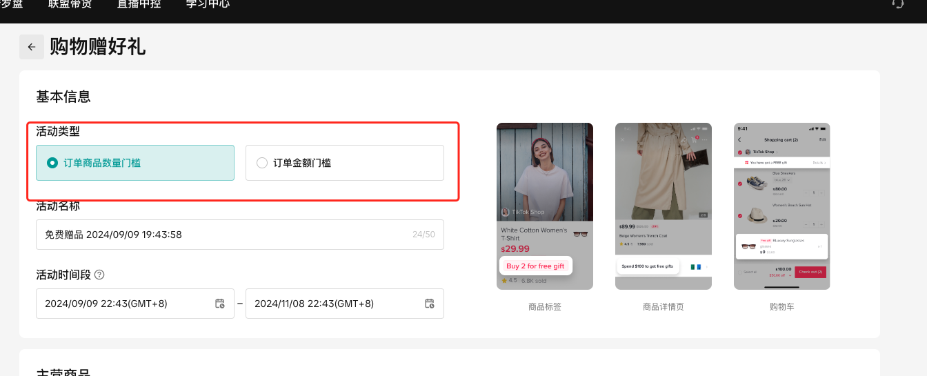 商家后台>>营销中心>>促销工具>>创建促销活动>>购物赠好礼>>创建
