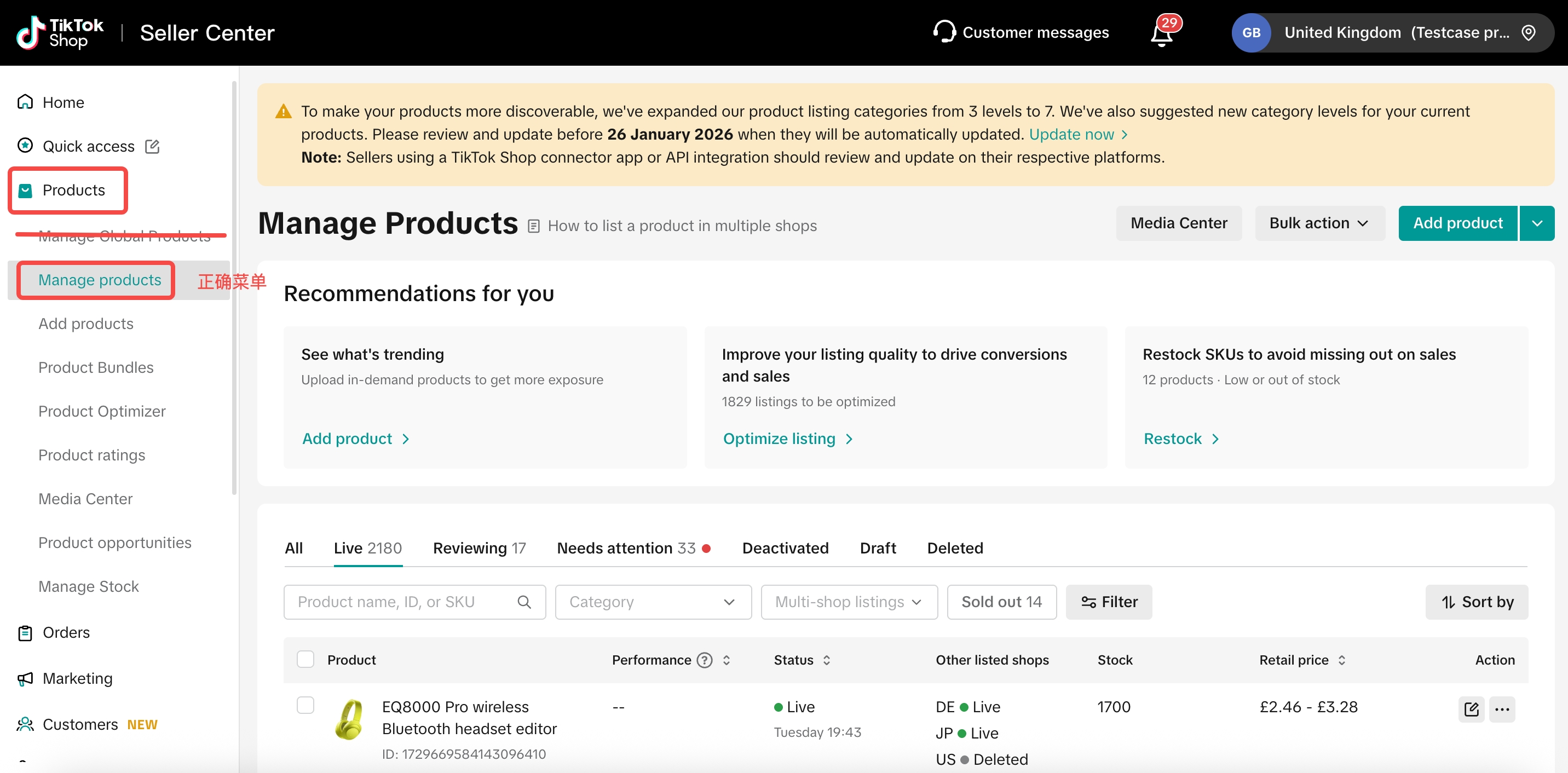 | 打开”商品-商品管理”页面,发布商品 请注意:不要在菜单「管理全球商品」发布,否则会发布失败。 如未看到此菜单,请联系AM,AM会提交白名单帮您开通菜单权限。 平台将于11月10日强制升级到新菜单,后续「管理全球商品」菜单废弃。 | ![]() ![]() 1. 打开卖家中心。 2. 在左侧菜单中,选择“Products(商品)”,单击“Manage Products (商品管理)”。 3. 填写属性发布商品即可,发品时请注意以下几点:详细规则请您阅读:Pre-Owned Products Policy 产品标题 – 包袋:必须注明“二手”、品牌名称、材质、款式。 – 鞋类:必须包括“二手”、品牌名称、款式名称、制造、鞋类类型。 – 手表:必须注明“二手”、品牌名称、型号。 – 例如:Pre-Owned Louis Vuitton Neverfull Tote 商品状态 – 完好:无使用痕迹;搬运或储存造成的瑕疵极小;可能包括原包装和配件。 – 优秀:干净且磨损轻微;只有仔细检查才能看到微弱的痕迹或表面磨损。 – 非常好:有轻微使用痕迹;轻微磨损、折痕或细微划痕。 – 良好:有明显的使用痕迹;可见的磨损或划痕,但不影响功能或使用。 认证机构 – 需选择规定的认证机构,否则会审核失败,详见本文:证书(COA)要求 – 目前为:Entrupy、Real Authentication、LegitMark、LegitApp、CheckCheck |