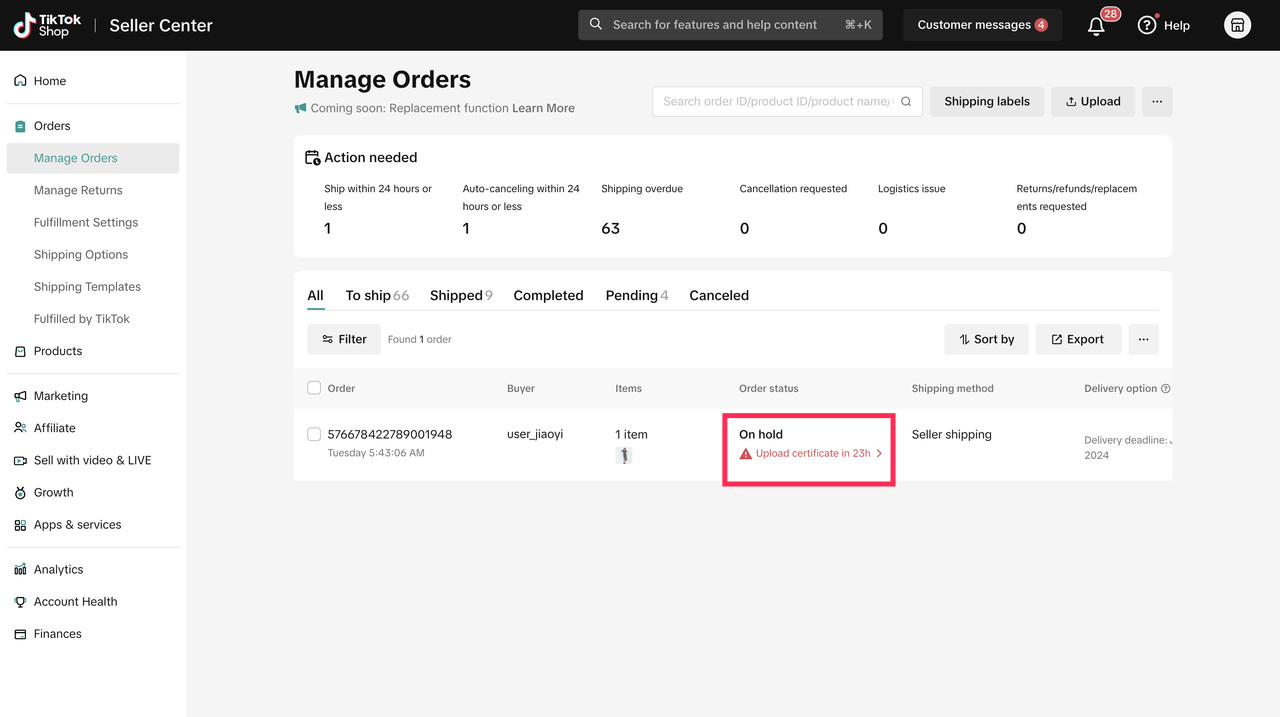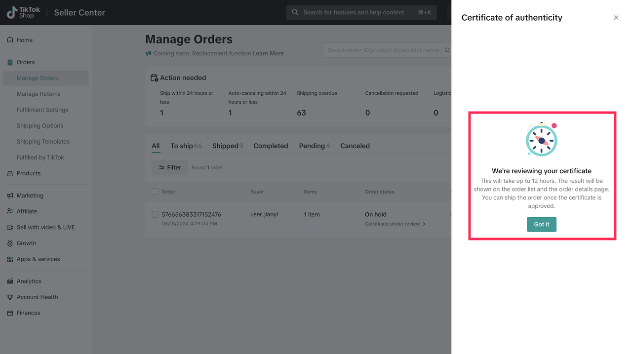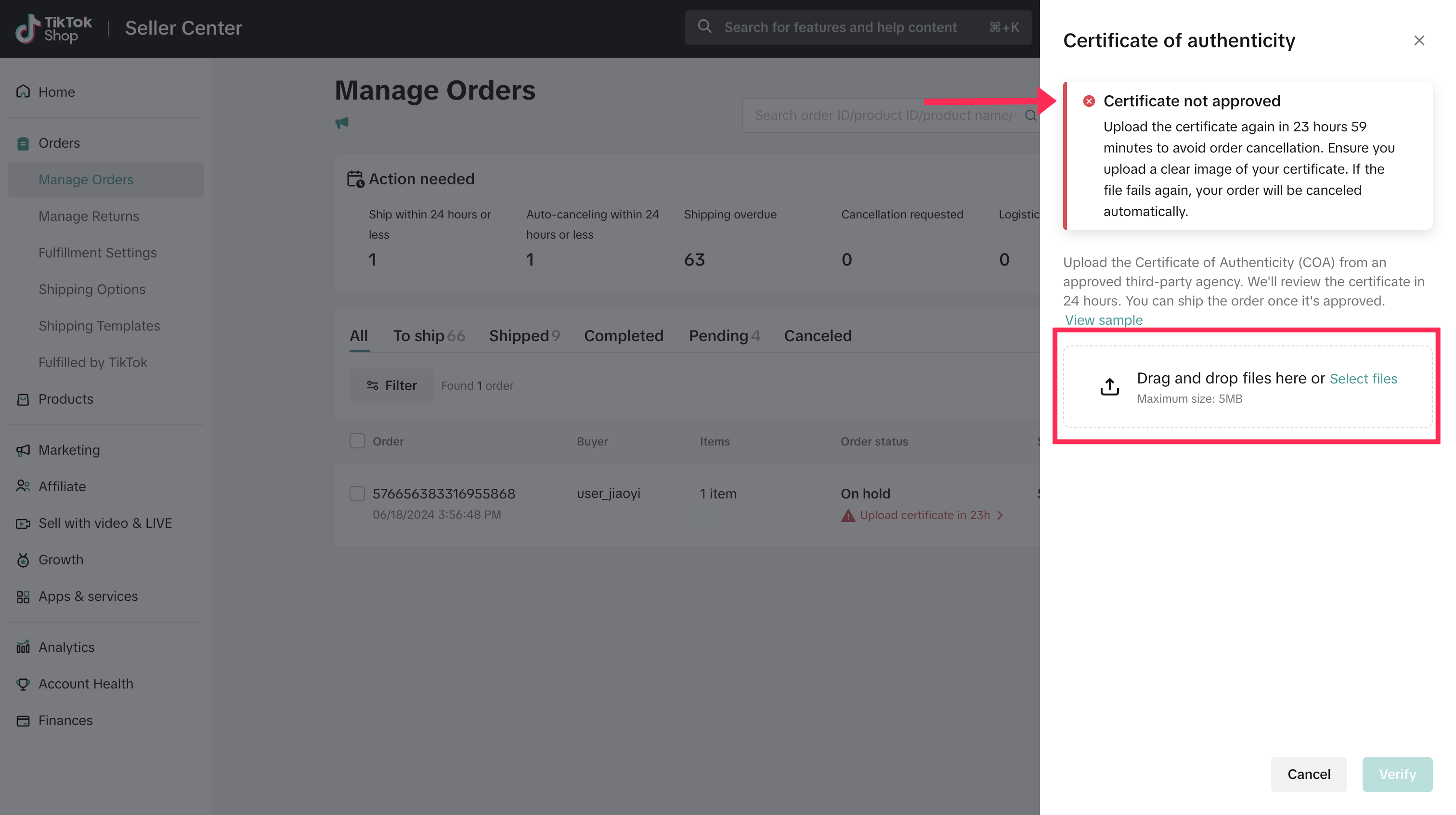 | 及时查看订单状态,上传证书/发货 请您注意以下三点: – 24小时内上传COA – 提交后检查 COA 的状态,以确保您不会错过重要更新或重新提交 COA 的请求 – 确认您的 COA 清晰易读 | 状态一共有4种: – 暂停 – 24 小时内上传证书 On Hold – Upload Certificate in 24h – 证书必须在 24 小时内上传,将倒计时您上传 COA 的剩余时间(例如,暂停 – 20 小时 59 分钟后上传证书)。 – 暂停 – 证书正在审核中 On Hold – Certificate under review – 取消 Canceled – 等待发货 Awaiting shipment 状态1:暂停 – 24 小时内上传证书 ![]() ![]() 此状态要求卖家上传COA,代表您未上传或者上传后审核不通过 请注意:商家有2次上传机会,如您看到未审核通过,请在规定的时间内再次上传。如果未在指定时间内上传或审核不通过,订单将被自动取消。 ![]() ![]() 状态2:暂停 – 证书正在审核中 ![]() ![]() 提交产品 COA 后,您将看到“暂停 – 证书正在审核”状态。 此状态表示 TikTok Shop 已收到您的 COA,目前正在验证其真实性。 ![]() ![]() 状态3:取消 ![]() ![]() 取消状态可能是由以下任何原因造成的。 – 第一份或第二份 COA 未在 24 小时内上传 – 第一次 COA 上传失败,第二次上传未在 24 小时内完成 – 第二份 COA 已上传,但由于信息缺失或不匹配而被拒绝 – 买家在首次购买后 1 小时内取消订单 ![]() ![]() 状态4:等待发货 ![]() ![]() 如果 COA 审核通过,您的订单状态将自动转为等待发货状态。 |