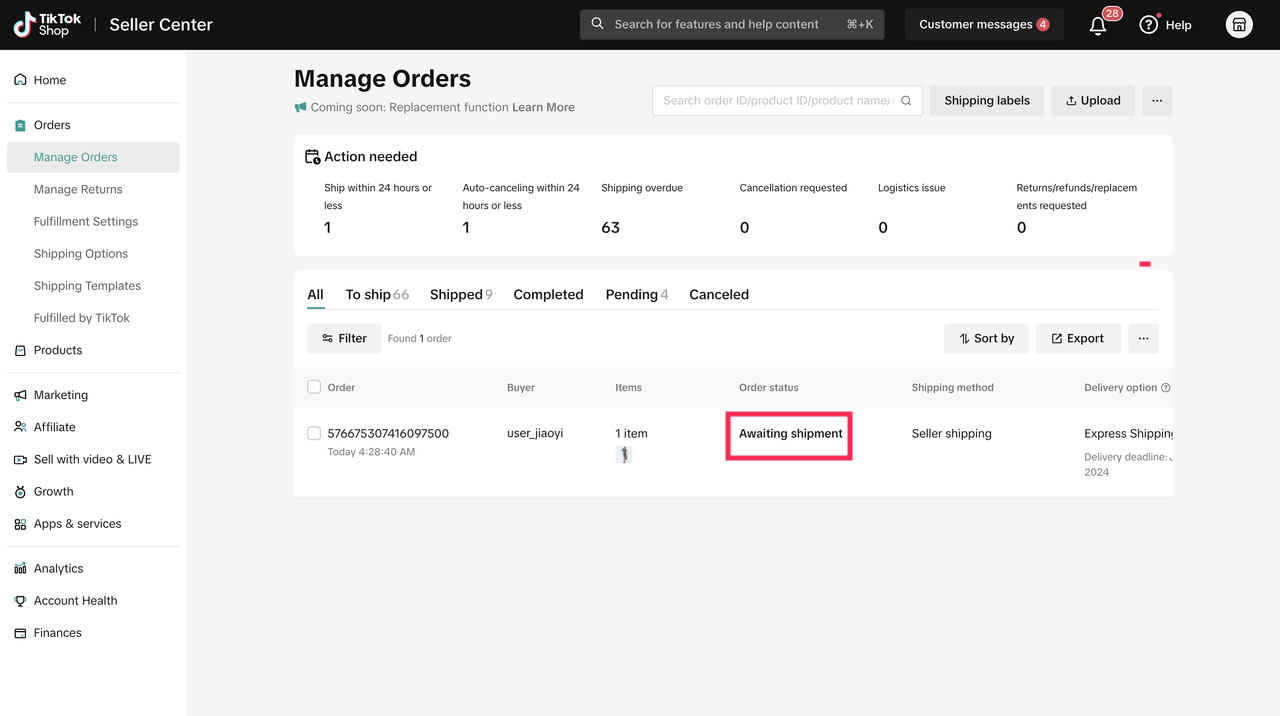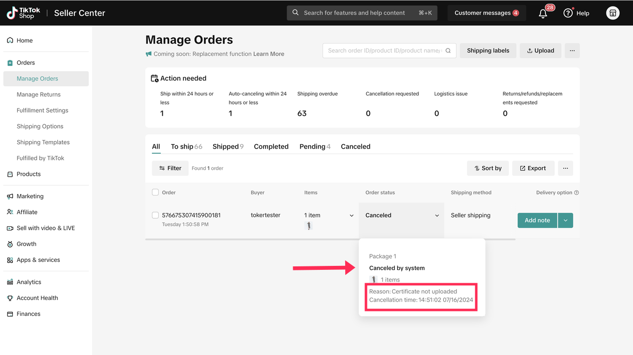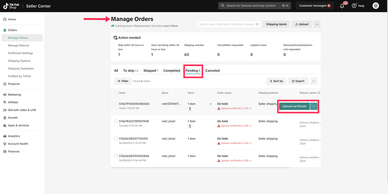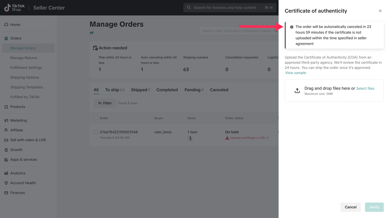 | 及时查看订单状态,上传证书/发货 请您注意以下三点: – 24小时内上传COA – 提交后检查 COA 的状态,以确保您不会错过重要更新或重新提交 COA 的请求 – 确认您的 COA 清晰易读 | 状态一共有4种: – 暂停 – 24 小时内上传证书 On Hold – Upload Certificate in 24h – 证书必须在 24 小时内上传,将倒计时您上传 COA 的剩余时间(例如,暂停 – 20 小时 59 分钟后上传证书)。 – 暂停 – 证书正在审核中 On Hold – Certificate under review – 取消 Canceled – 等待发货 Awaiting shipment 状态1:暂停 – 24 小时内上传证书 ![]() ![]() 此状态要求卖家上传COA,代表您未上传或者上传后审核不通过 请注意:商家有2次上传机会,如您看到未审核通过,请在规定的时间内再次上传。如果未在指定时间内上传或审核不通过,订单将被自动取消。 ![]() ![]() 状态2:暂停 – 证书正在审核中 ![]() ![]() 提交产品 COA 后,您将看到“暂停 – 证书正在审核”状态。 此状态表示 TikTok Shop 已收到您的 COA,目前正在验证其真实性。 ![]() ![]() 状态3:取消 ![]() ![]() 取消状态可能是由以下任何原因造成的。 – 第一份或第二份 COA 未在 24 小时内上传 – 第一次 COA 上传失败,第二次上传未在 24 小时内完成 – 第二份 COA 已上传,但由于信息缺失或不匹配而被拒绝 – 买家在首次购买后 1 小时内取消订单 ![]() ![]() 状态4:等待发货 ![]() ![]() 如果 COA 审核通过,您的订单状态将自动转为等待发货状态。 |