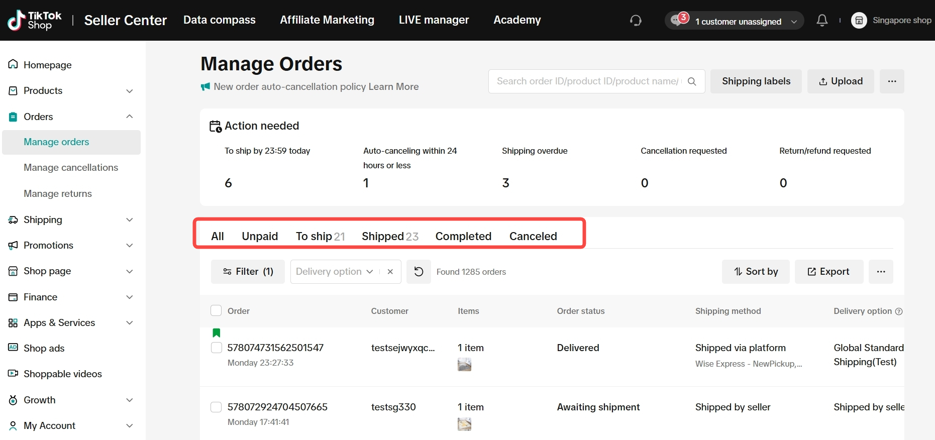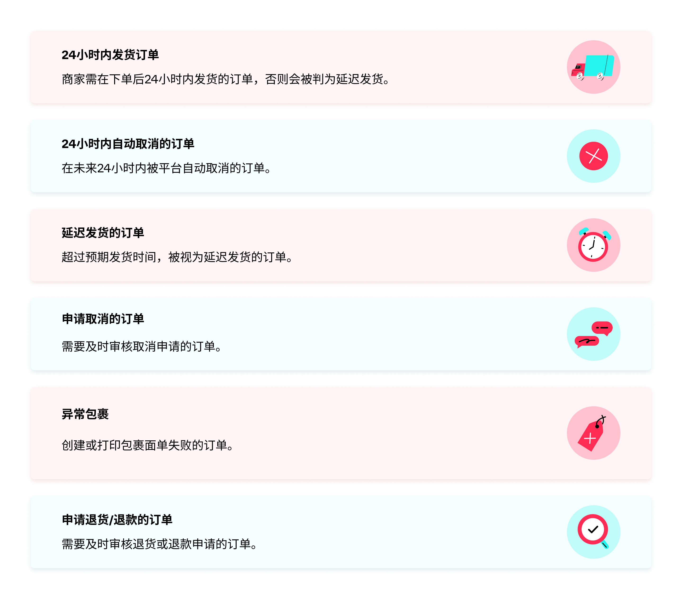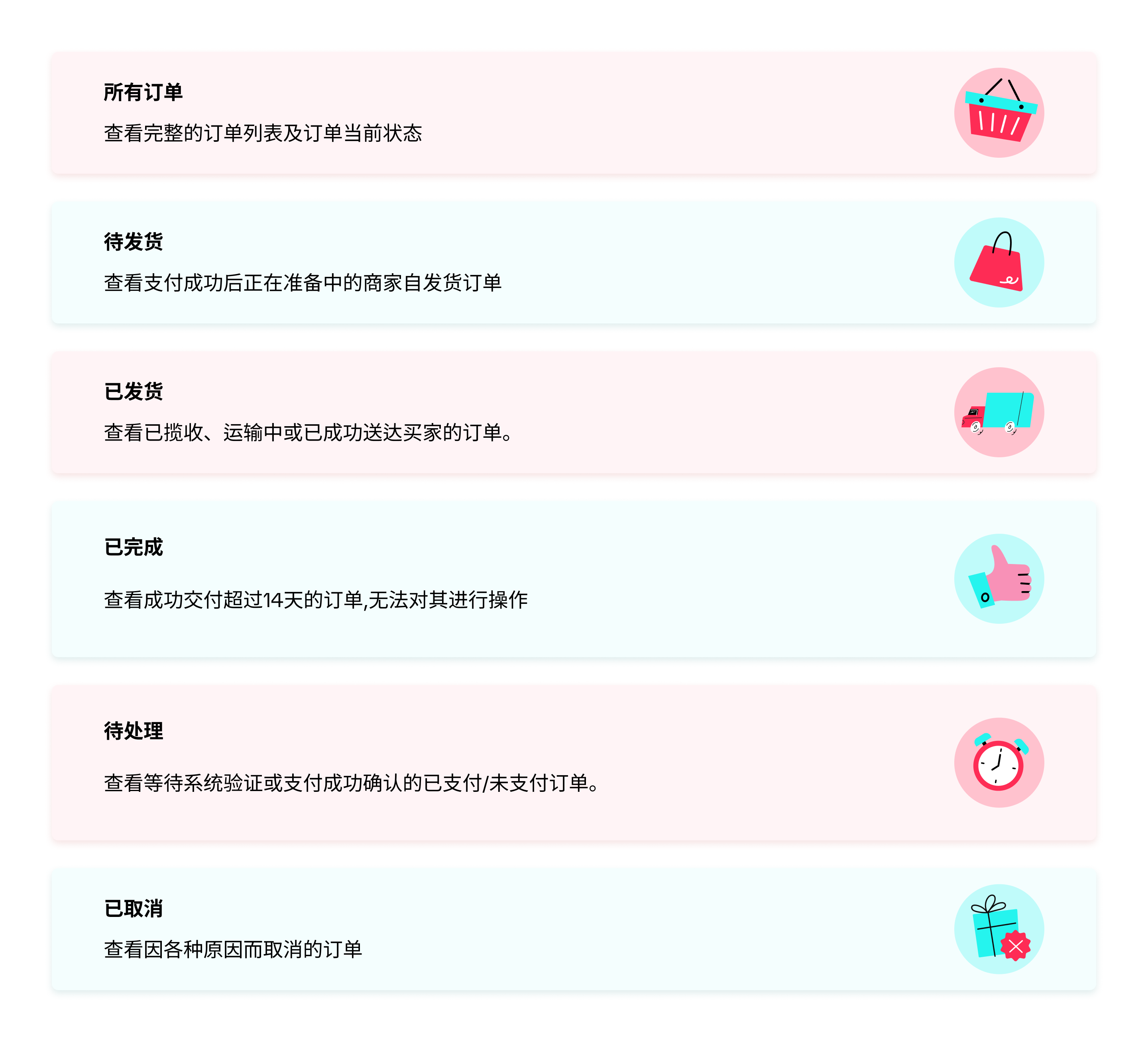 平台已优化“管理订单”页面的UI(用户界面)设计,新增了一个待处理标签页,可以提醒商家注意不要忽略任何关键订单。该标签页还突出显示了订单取消申请及退货/退款申请,让商家充分了解订单状况。