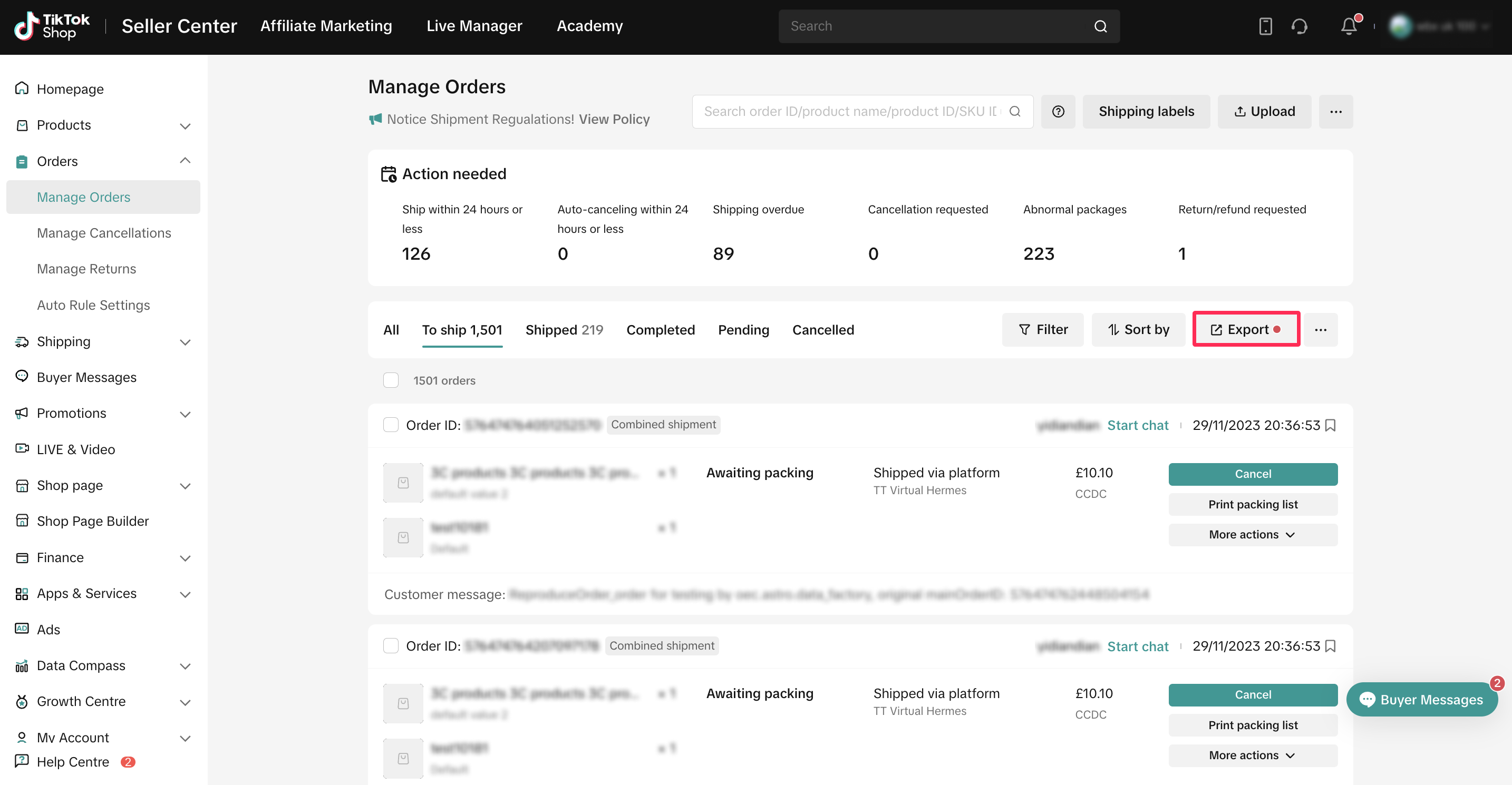 商家可在当前标签页下导出所有或选中的订单,进一步优化订单管理流程。