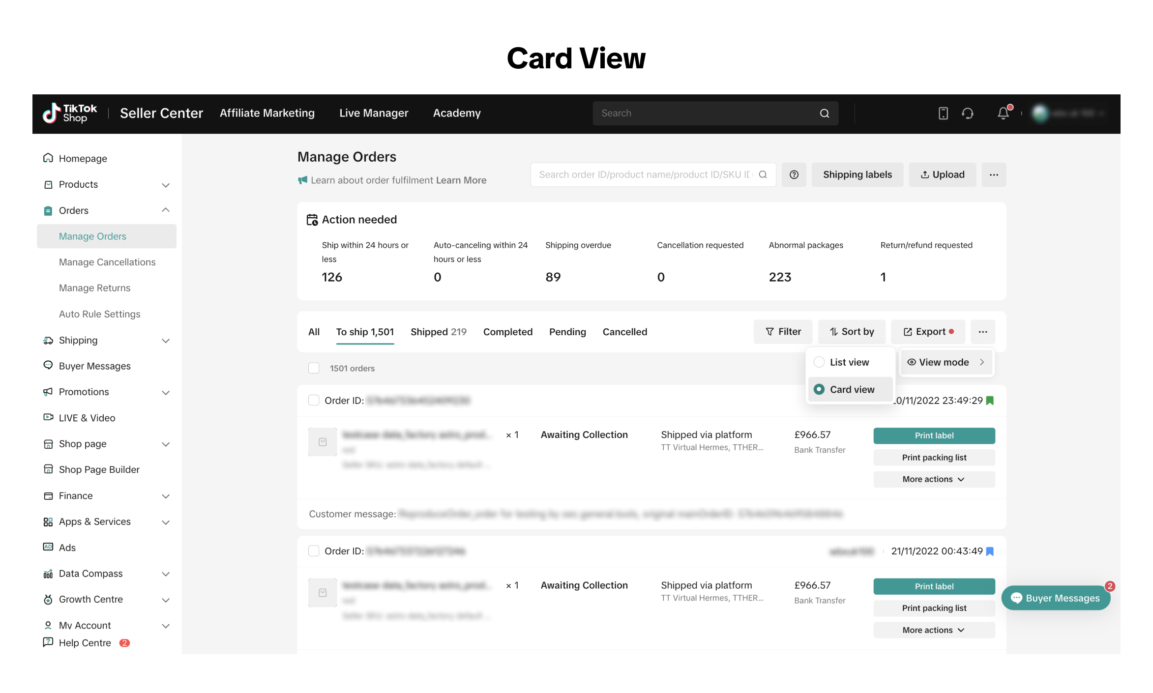 要管理订单,请前往“商家中心”并选择“订单”>“管理订单”。