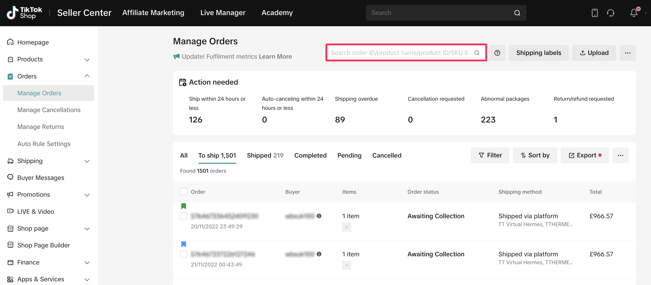 平台已优化和简化搜索功能,商家能使用新的全局搜索功能轻松找到订单。商家只需一个搜索框就能找到订单的各种信息,包括订单ID、运单号、商品ID及SKU信息等。