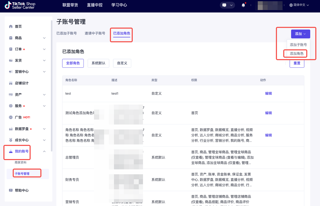 您可以将员工邮箱添加为商店的子账号,并为他们分配不同的角色以便完成日常操作如管理产品或跟踪订单。TikTok Shop提供了默认角色并为其预先设置了权限,以便您更轻松地管理子账号。您也可以创建和自定义角色,根据特定需求为其设置不同的权限。