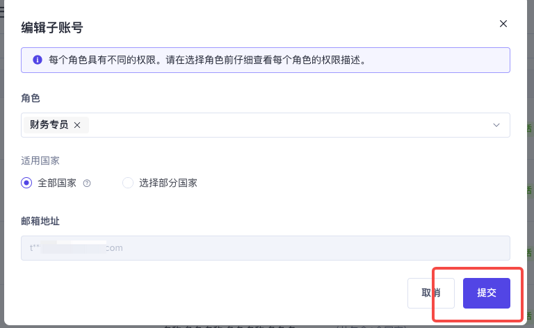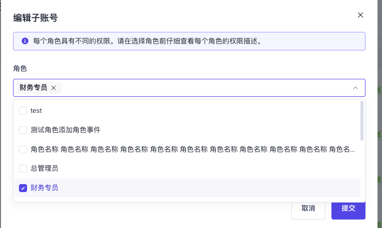 步骤二 在弹出窗口中进行编辑以选择要分配给此用户的角色,然后单击提交。