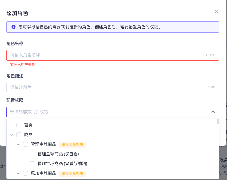 如果您发现默认角色与员工的工作范围不匹配,您可以自定义自己的角色。您最多可以添加100个角色。创建角色成功后,您可以将新角色分配给您的子帐户,如第3项所述。