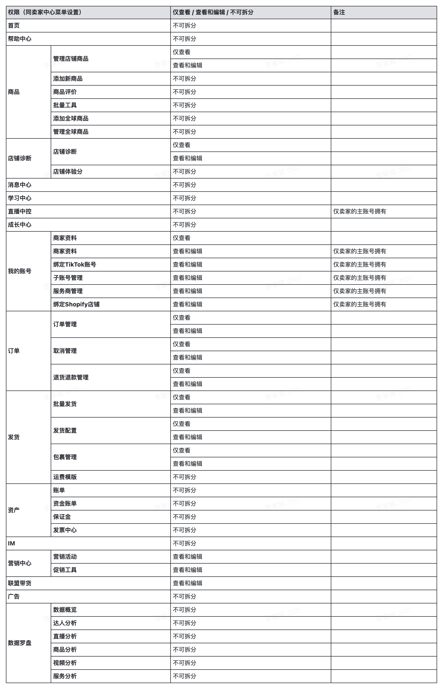 权限均根据卖家中心的菜单设置(如有变动),并分为仅查看或查看和编辑。部分权限不拆分。以下为已有功能菜单,仅供参考。卖家可在管理子账号或角色时,查看最新权限设置和划分。