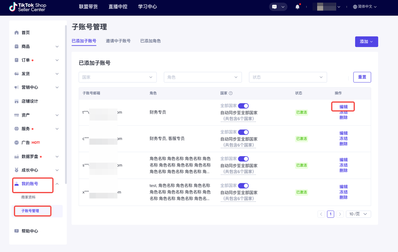步骤一 进入卖家中心,点击我的账号-用户管理-添加用户,然后单击某个用户的编辑按钮。