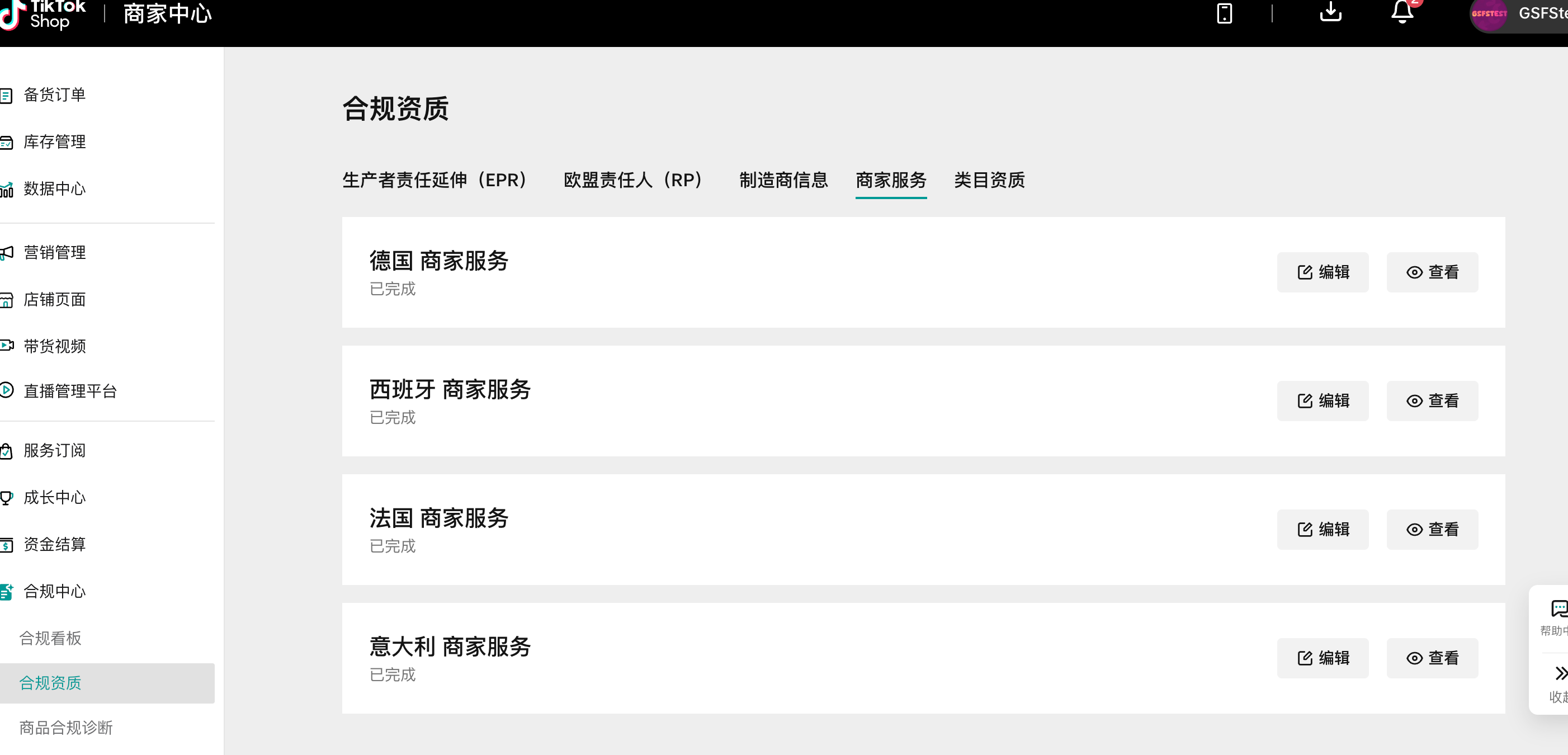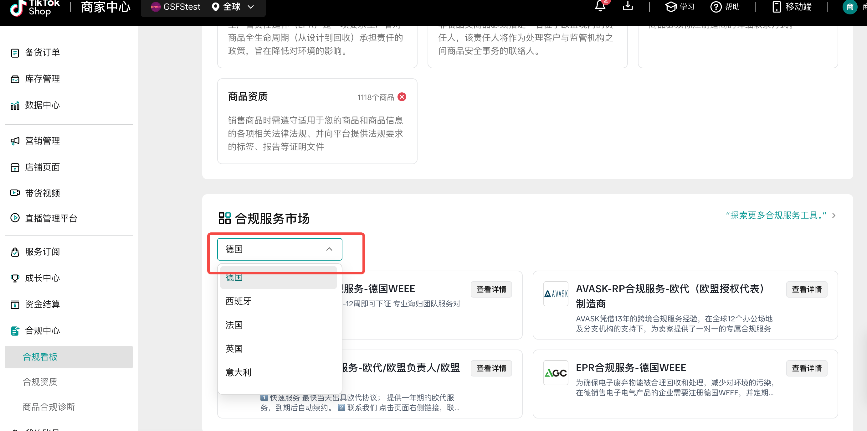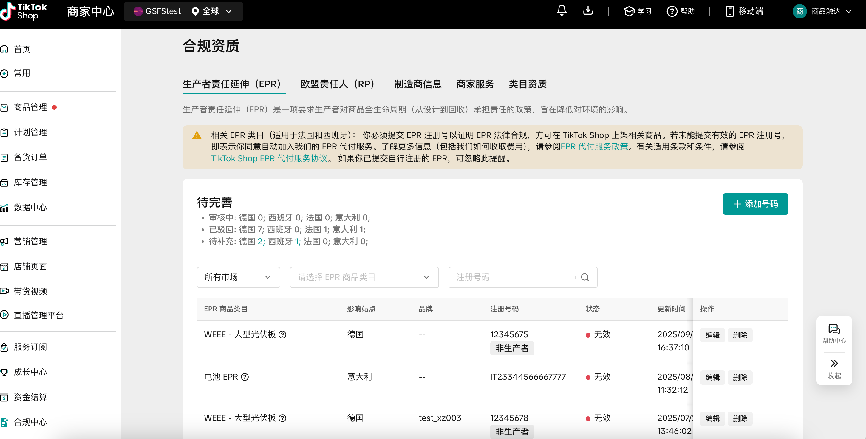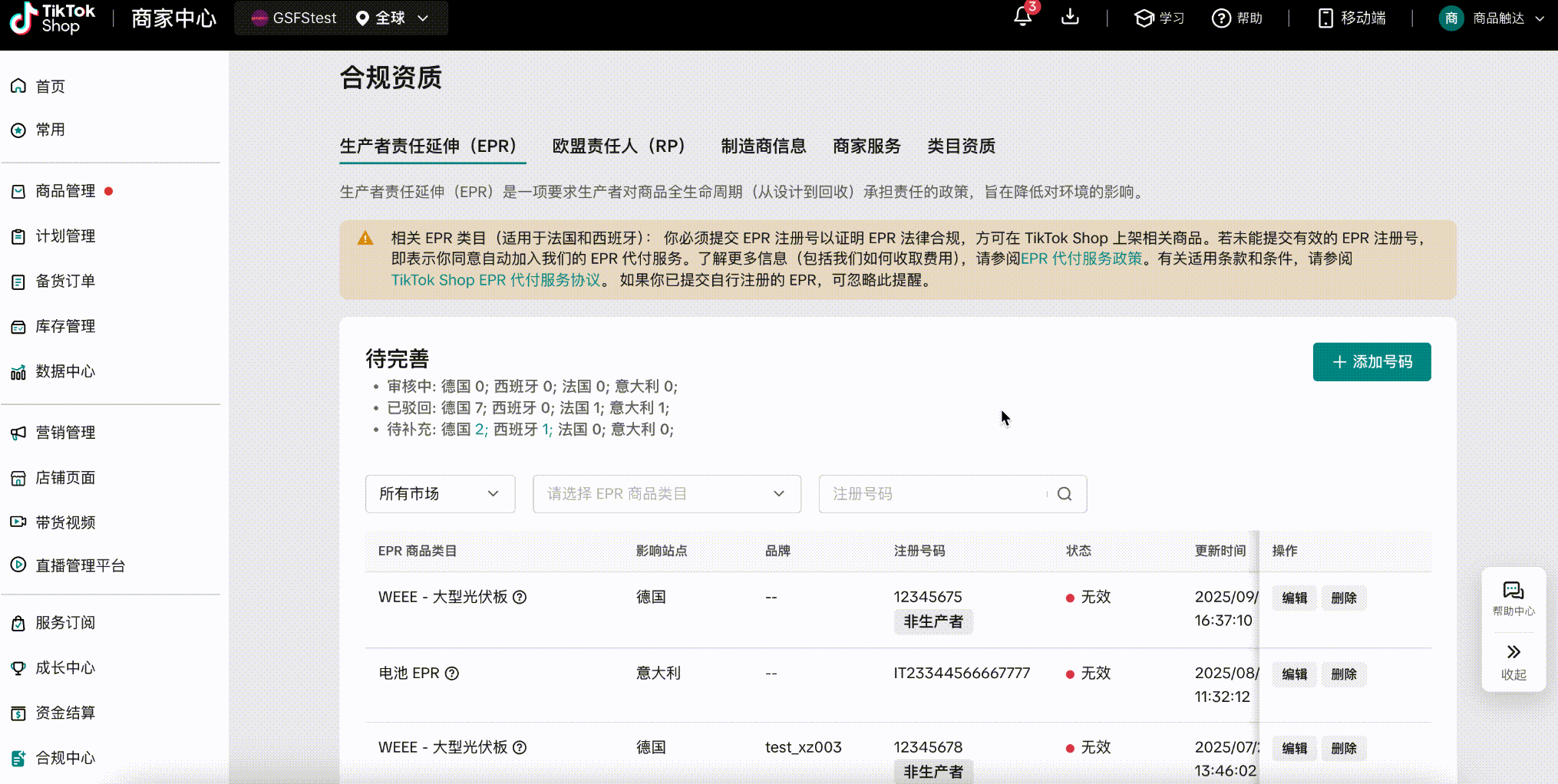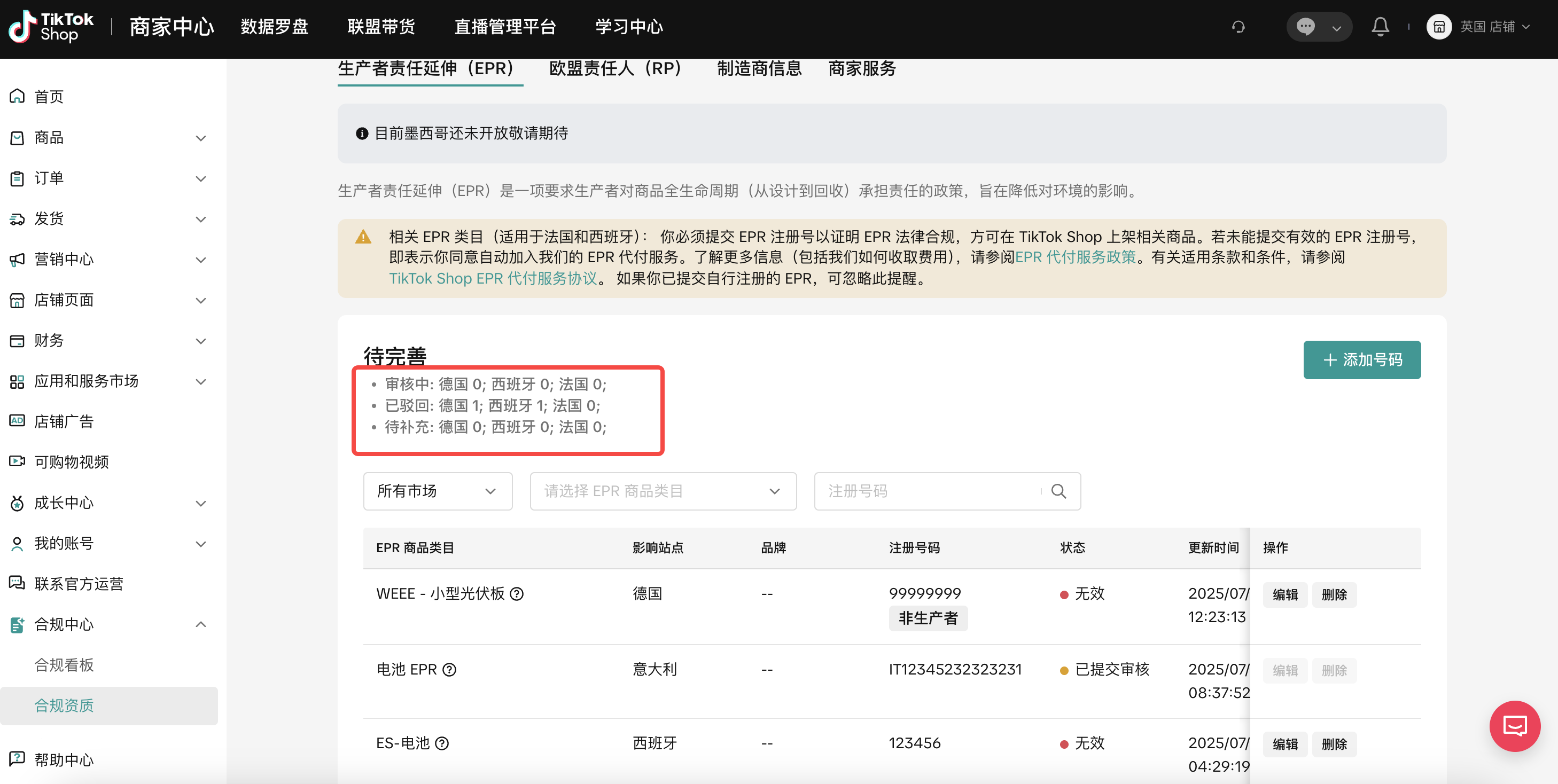 在合规资质模块选择对应国家的EPR注册