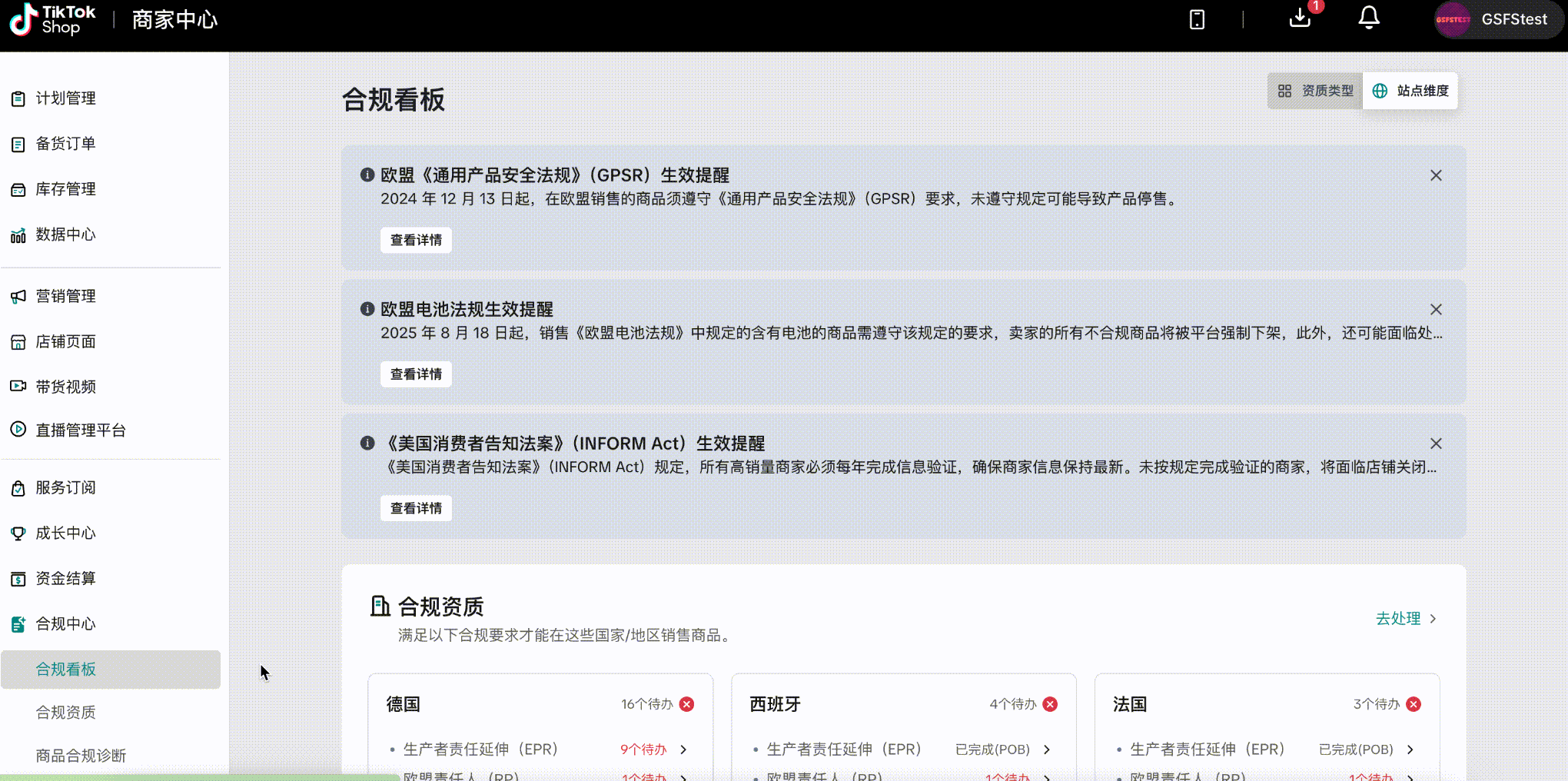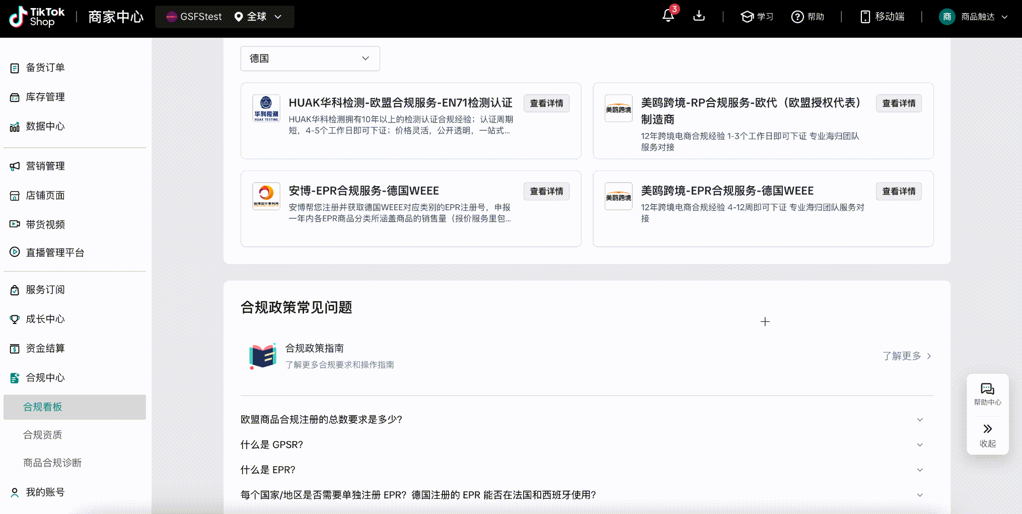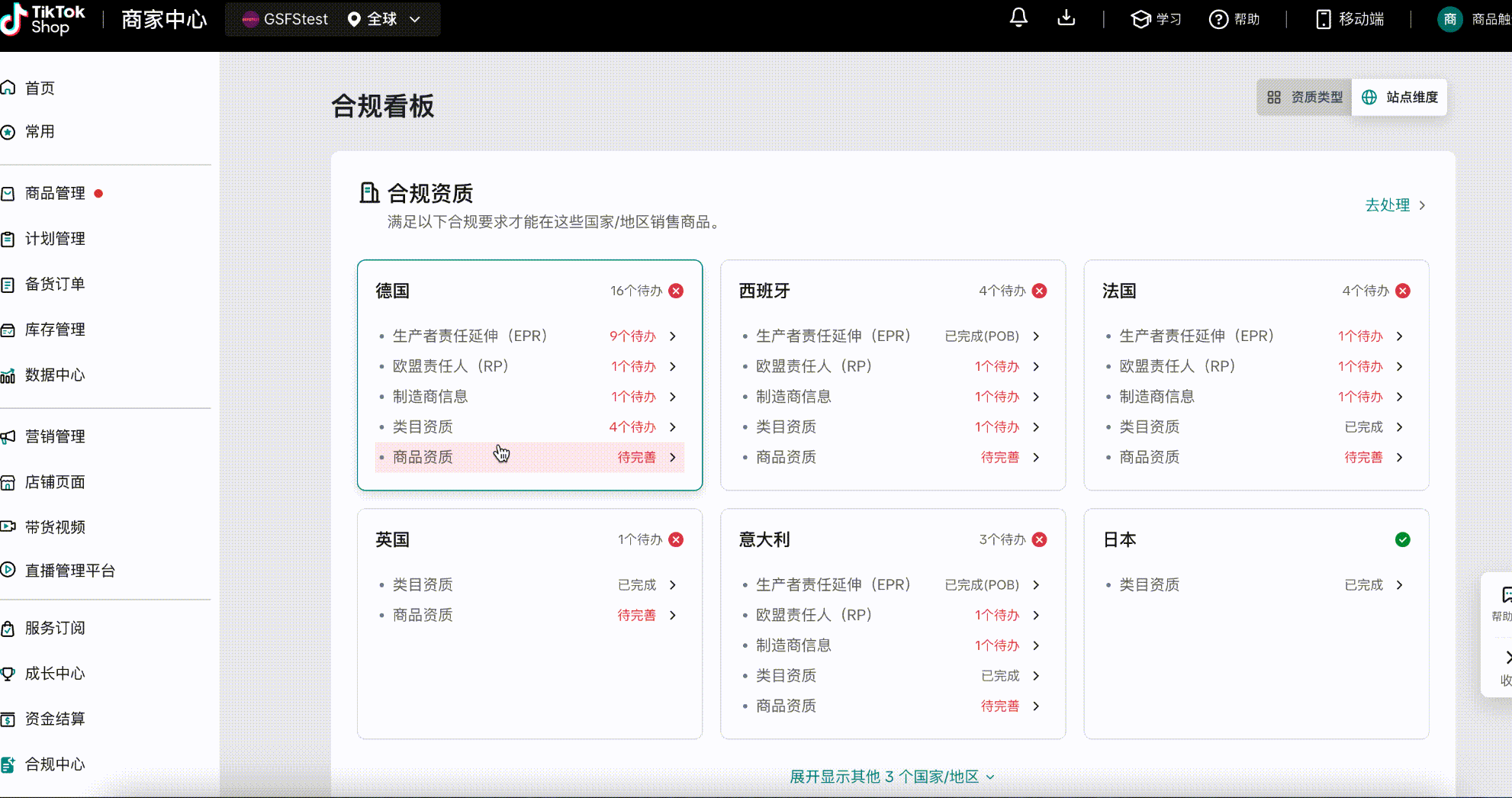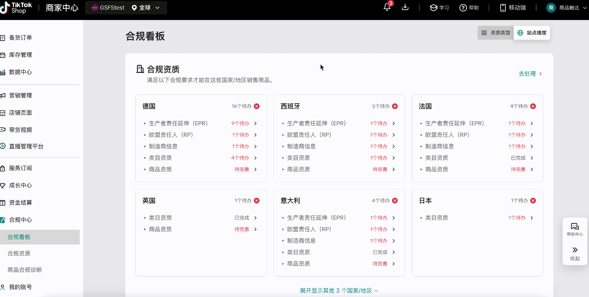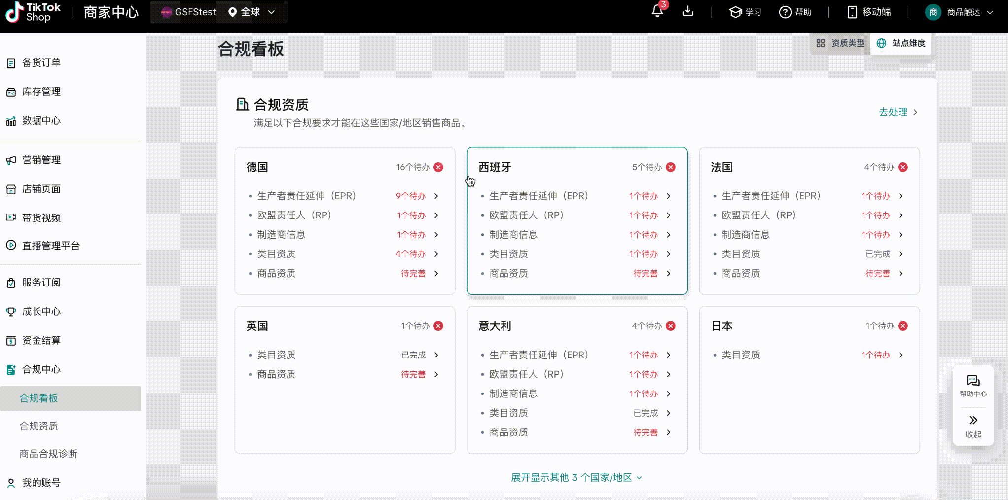 此模块展示商家已入驻的全部国家及合规总览,并按国家/地区显示卖家需要满足的各项合规资质要求,包括生产者责任延伸(EPR)、欧盟责任人(RP)等重要合规认证,并清晰列出每个国家/地区的待办事项数量。