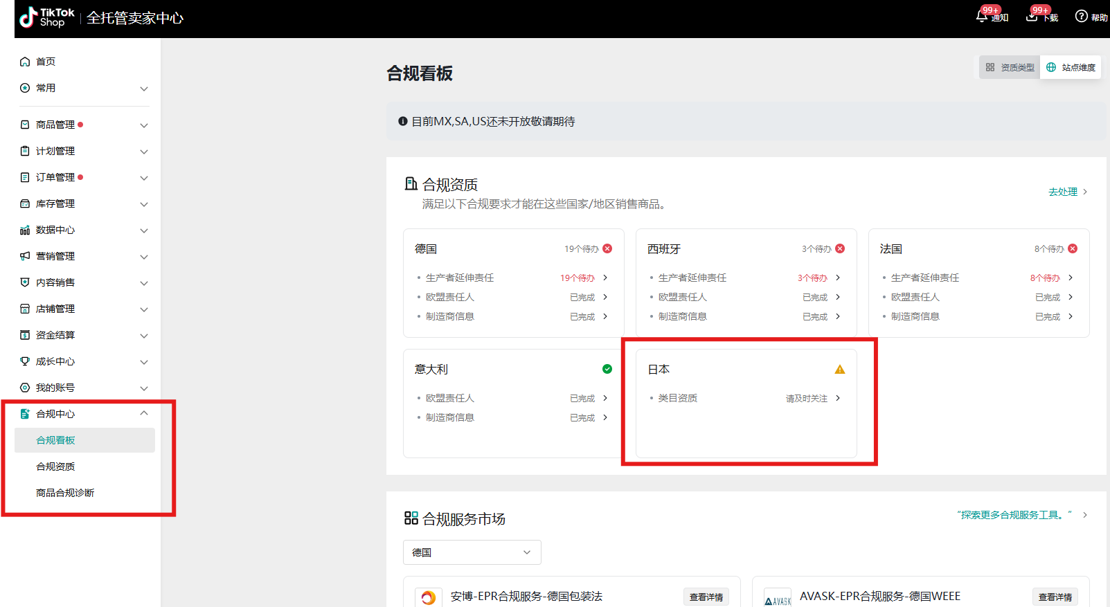 合规中心是一个专门为卖家提供合规管理服务的平台,帮助卖家集中查看和管理不同目标国家/地区的合规状态,轻松识别合规风险、处理待办事项并获取相关的支持与资源,专注于帮助卖家满足各国法规要求,避免因合规问题导致的销售限制问题。