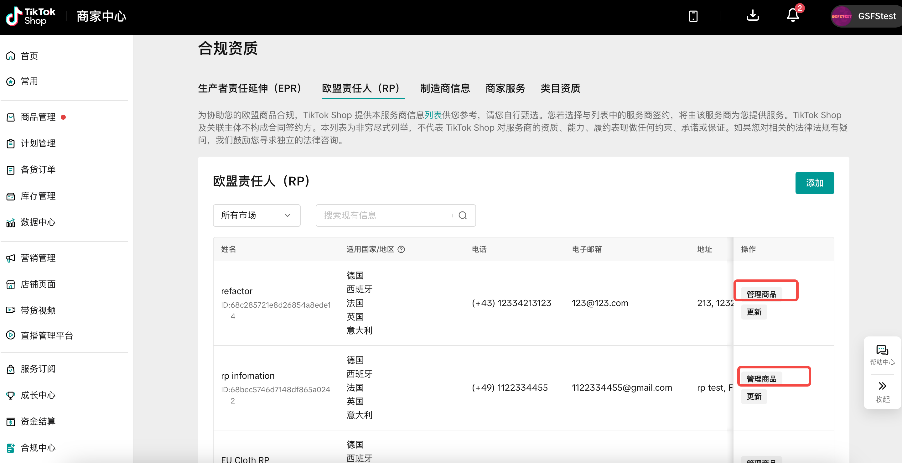 - 如果已经添加完成欧盟责任人,可直接去管理自己的商品进行绑定,也支持批量绑定商品:(如果没有绑定,系统将回扫出未绑定商品并展示在商品合规诊断页面,提醒商家处理)