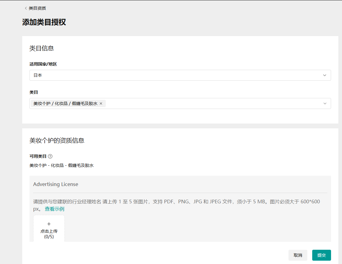 - 右上角可以添加类目资质/授权, 在类目授权页面可以选择国家和具体类目,如果该选择的类目需要资质会显示在下方,商家可以点击“查看示例”获得上传资质的示意图