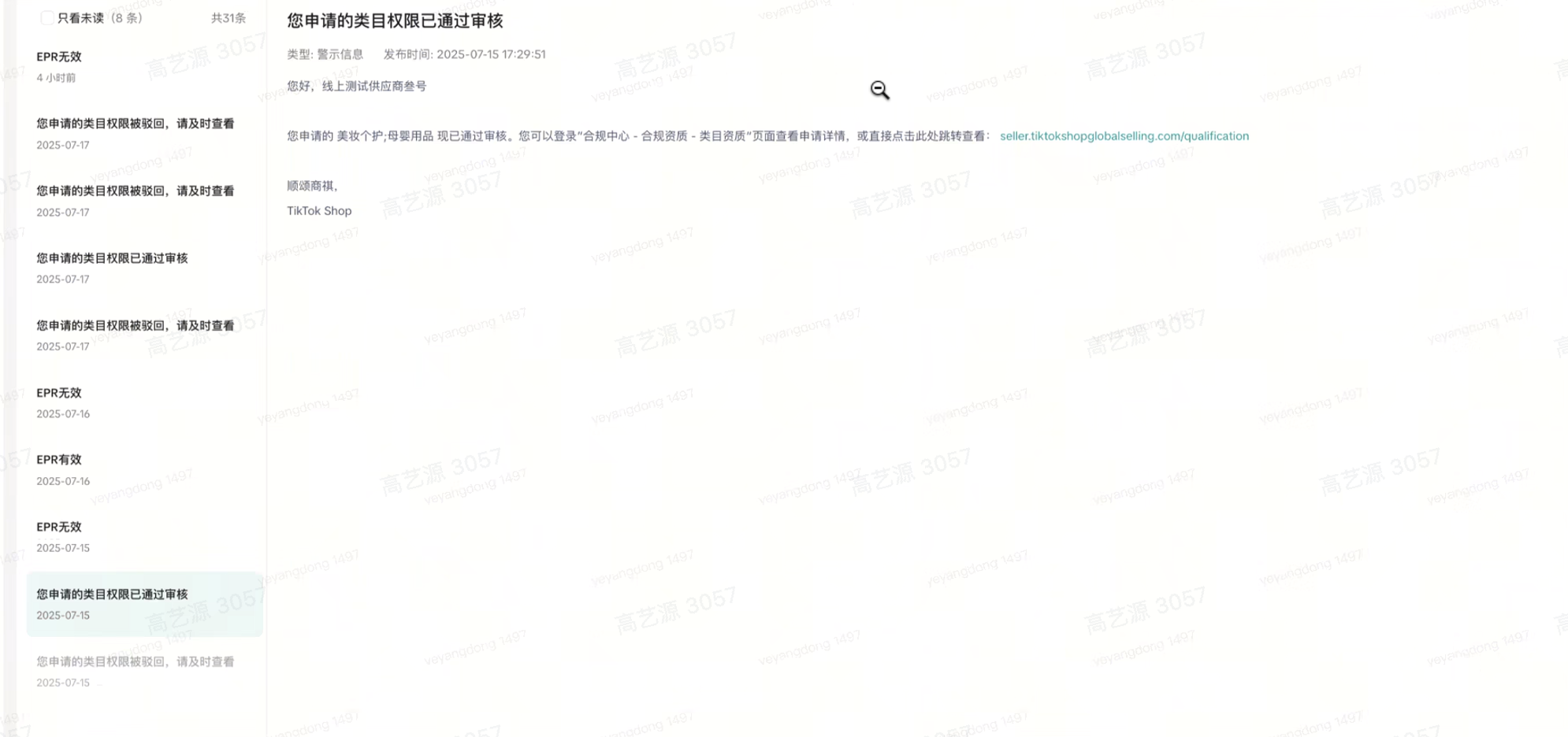- 商家类目资质提交审核后,将收到站内信及飞书通知审核结果: