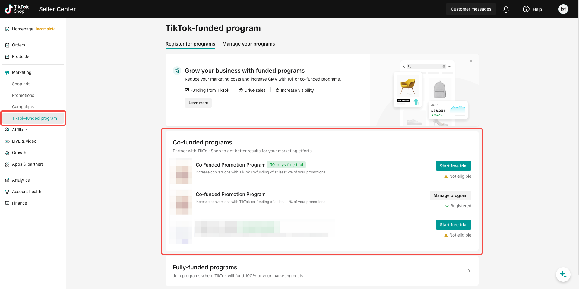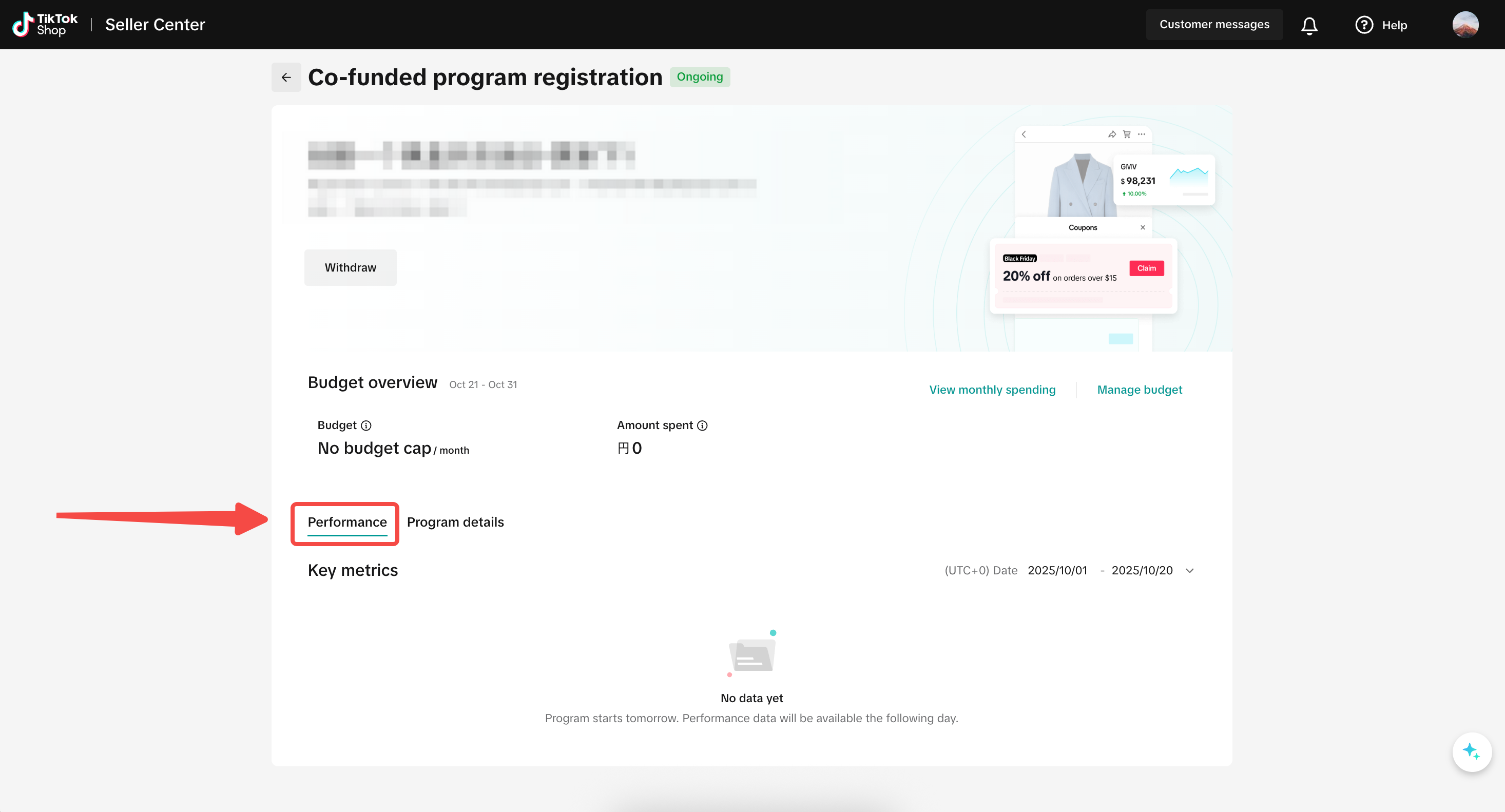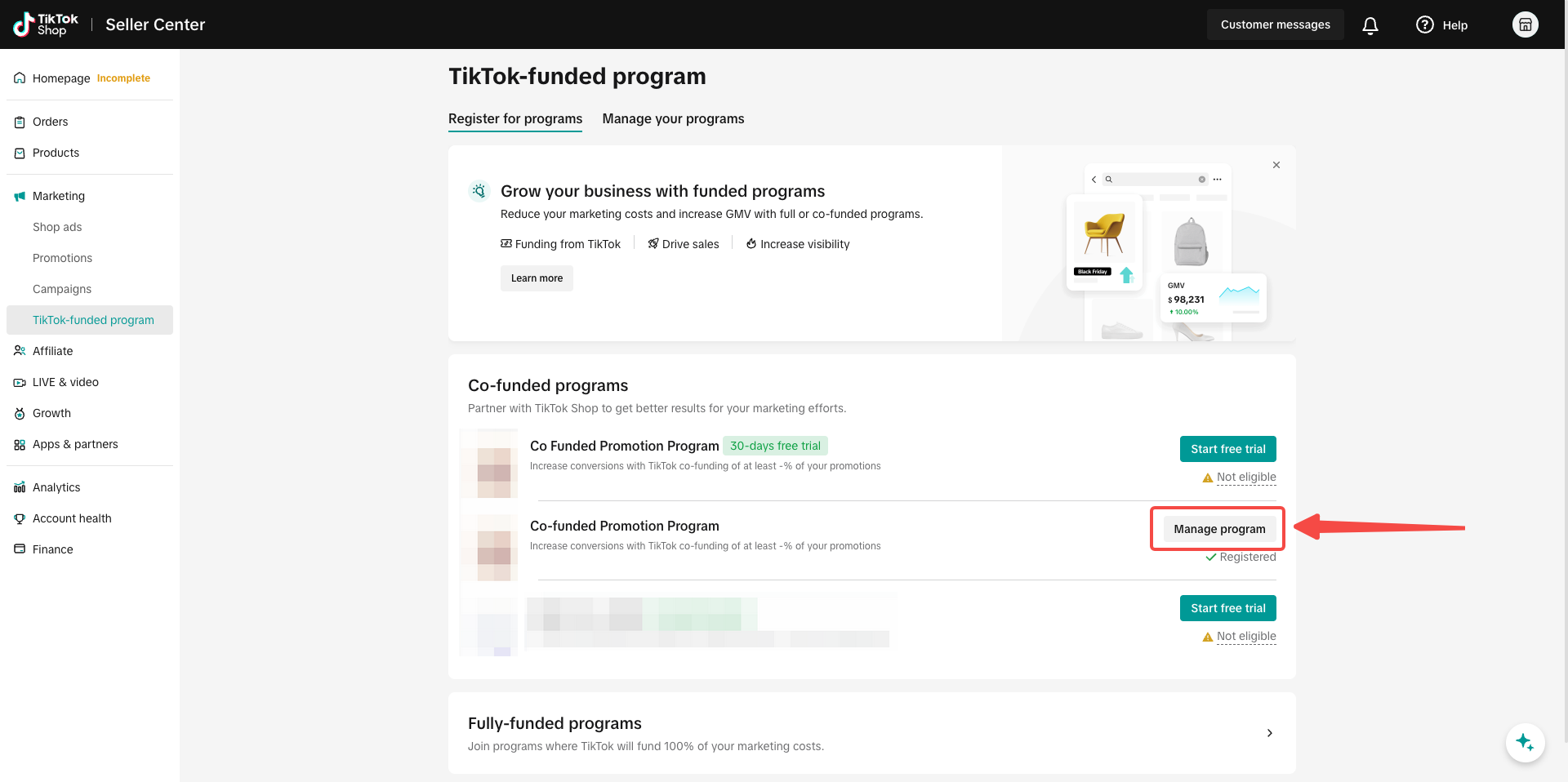 从商家中心进入营销中心 > TikTok资助计划 > 合资计划 > 管理计划